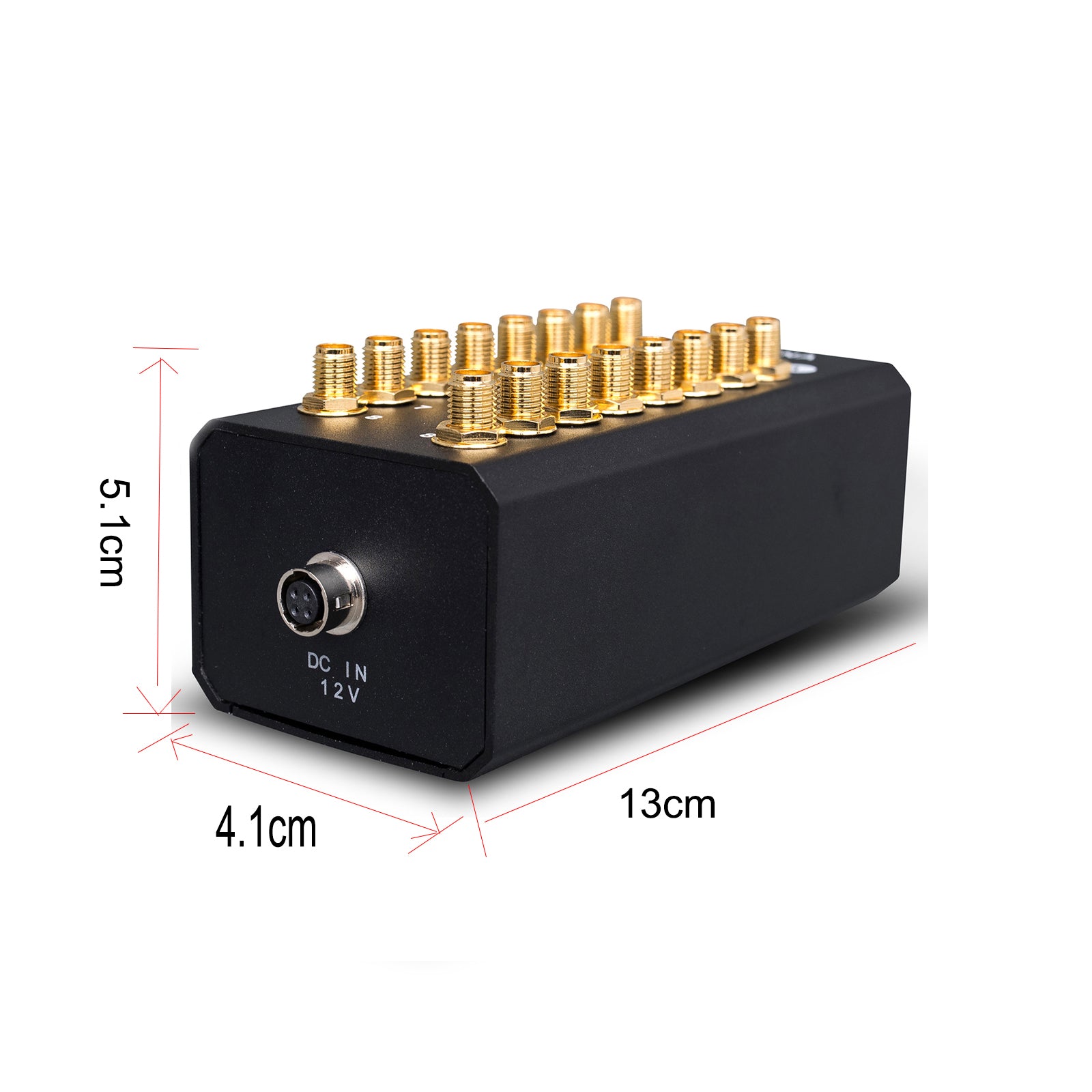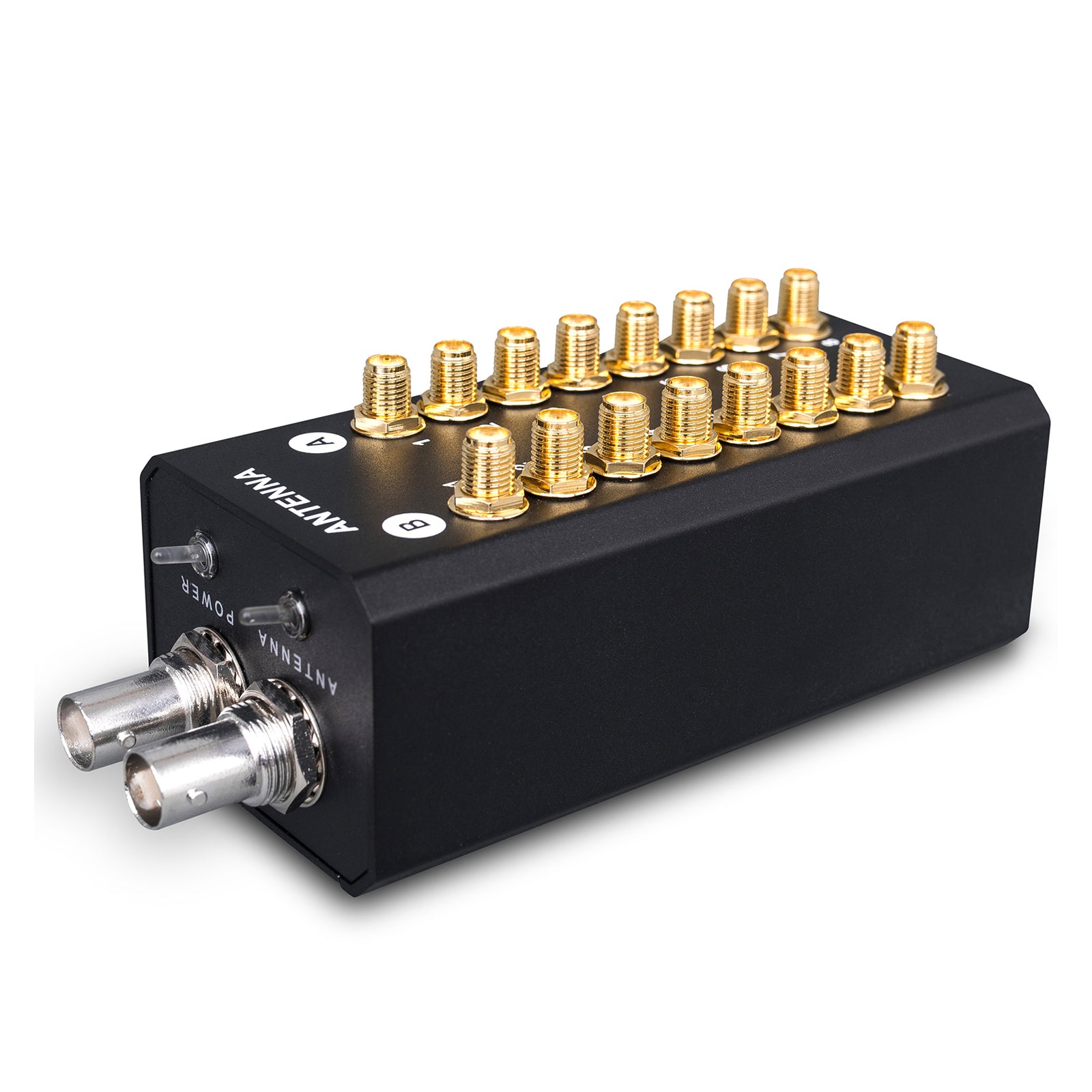 - Two BNC input socket can connect two 500-950MHz active antenna ,and every BNC socket can distribute eight SMA output socket to connect the antenna socket of the wireless receiver. So two BNC input socket can distribute total 16SMA output socket , two group1X8 RF distributor.