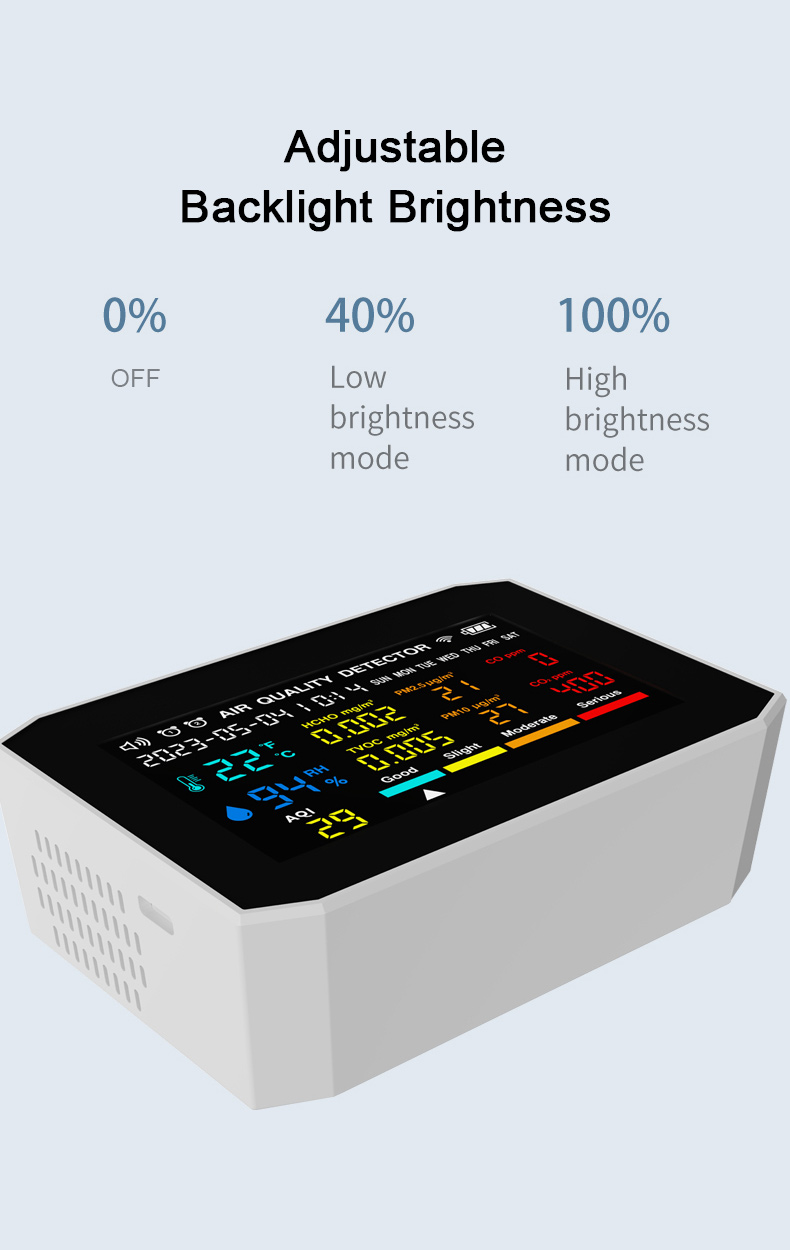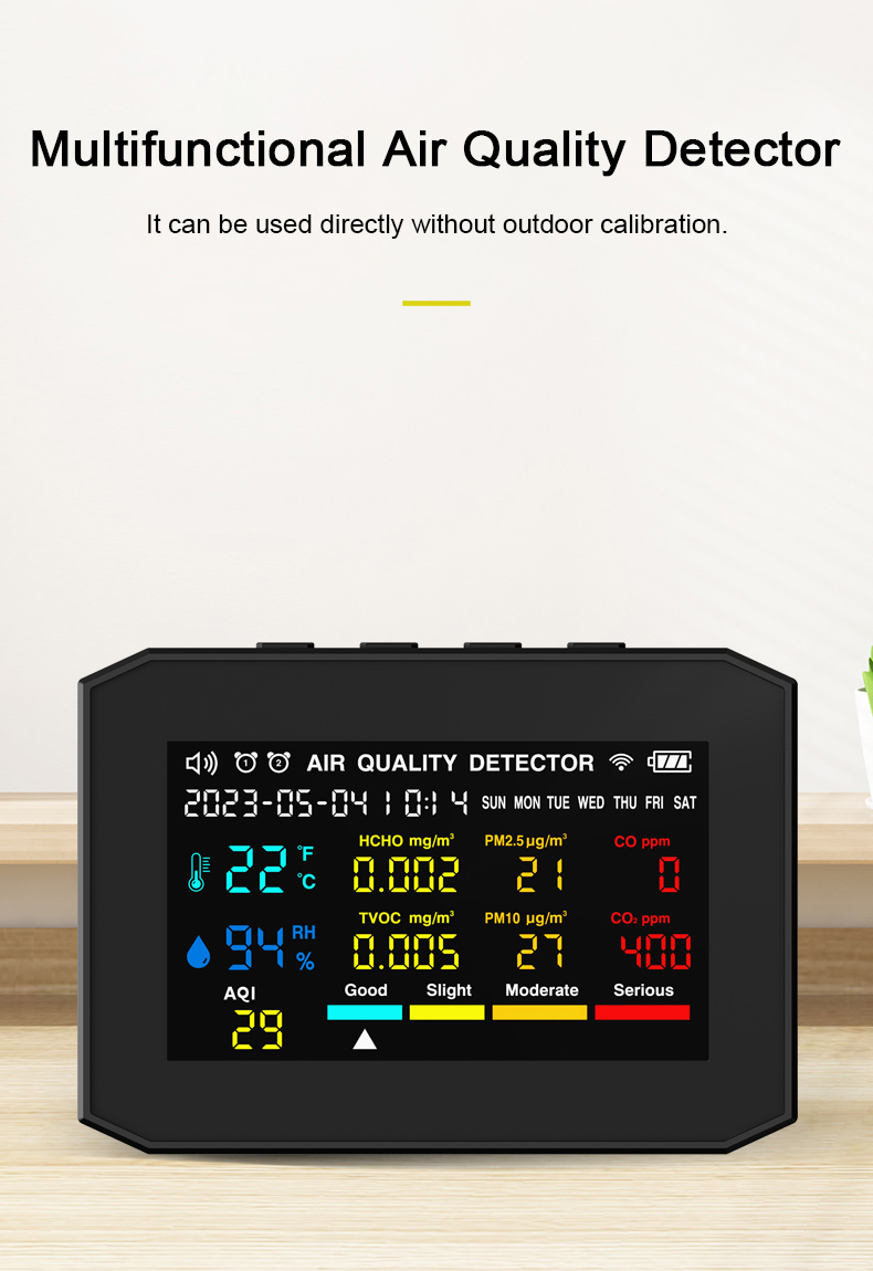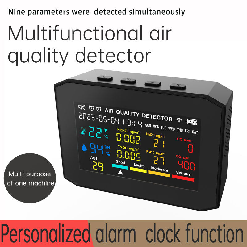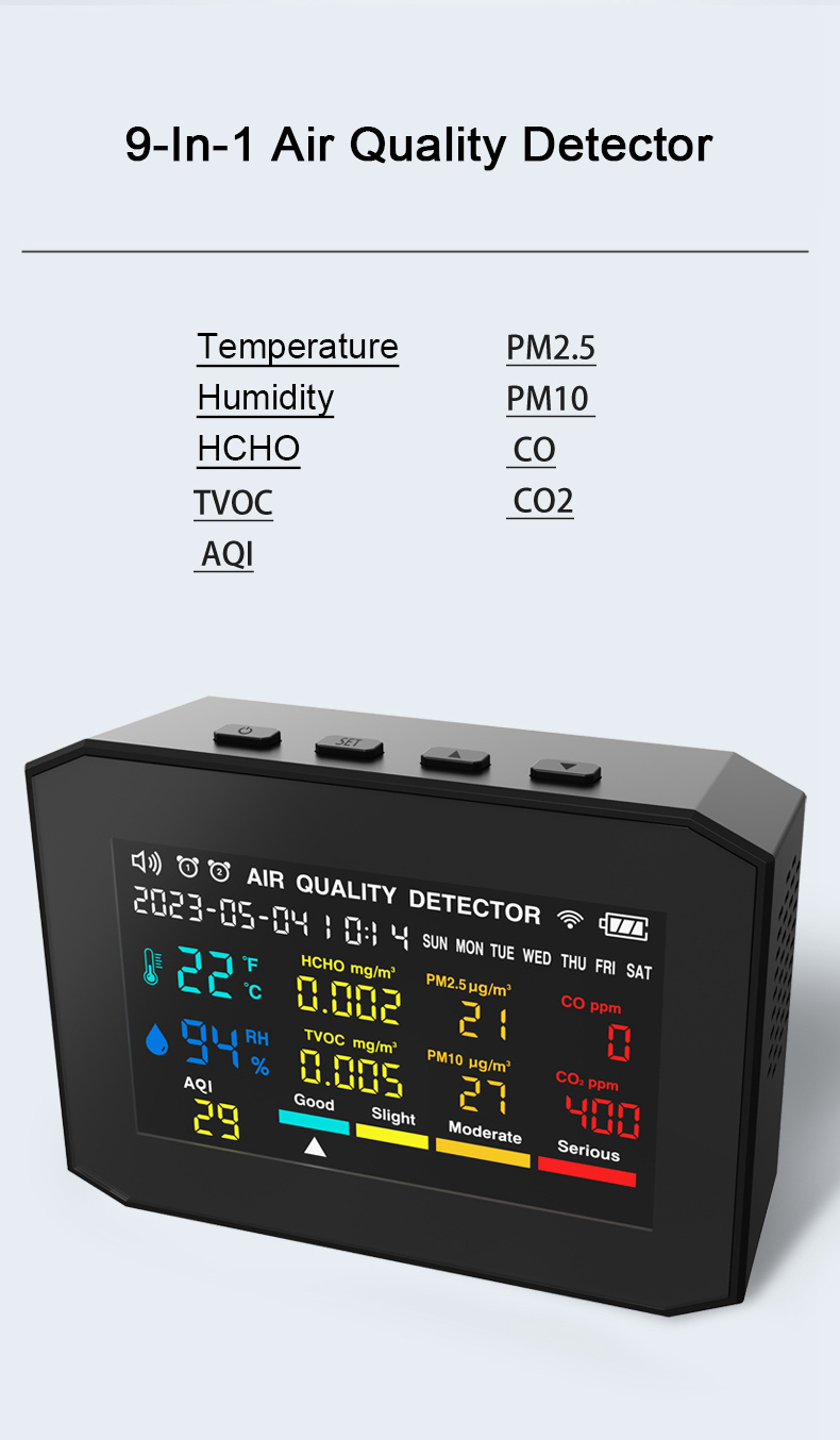 - 9-in-1 Air quality monitor: 9 kinds of parameters, including temperature, humidity, HCHO, TVOC, AQI, PM2.5, PM10, CO and CO2, can be measured at the same time.