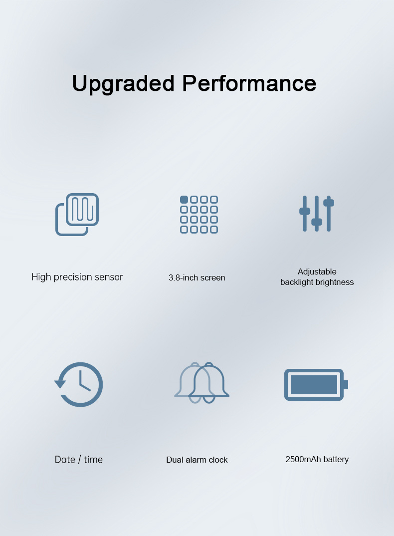 - Upgraded performance: high-precision sensor, 3.8-inch screen, adjustable backlight brightness, data/time display, dual clock alarm and 2500mAh battery.