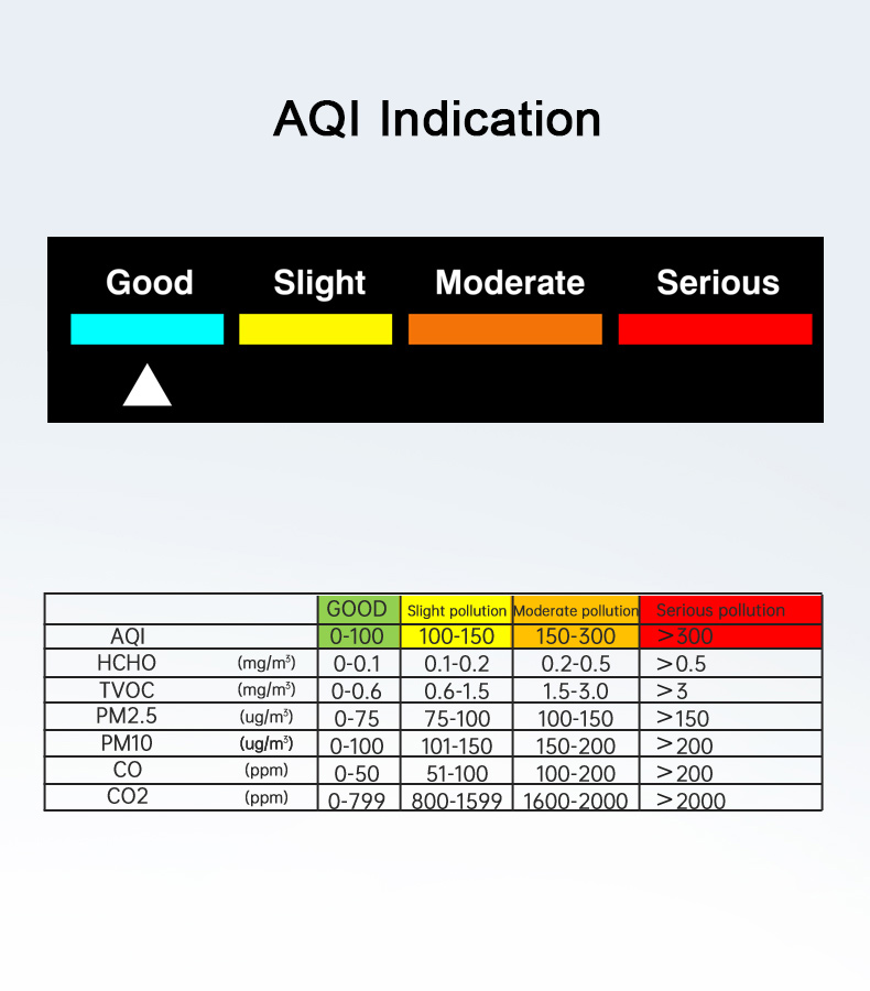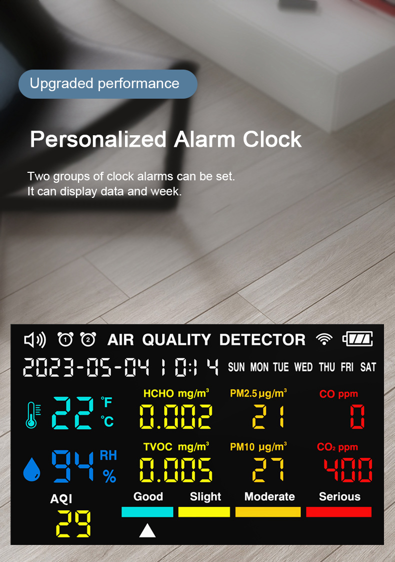 - Functions: AQI/HCHO/TVOC/PM2.5/PM10/CO/CO2/Temperature and humidity/calendar/alarm clock