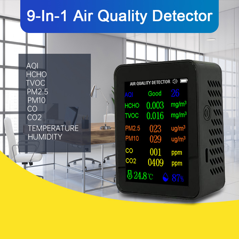 9-in-1 Air Quality Detector Monitor (Black) for AQI/HCHO/TVOC/PM2.5/PM10/CO/CO2/Temperature/Humidity