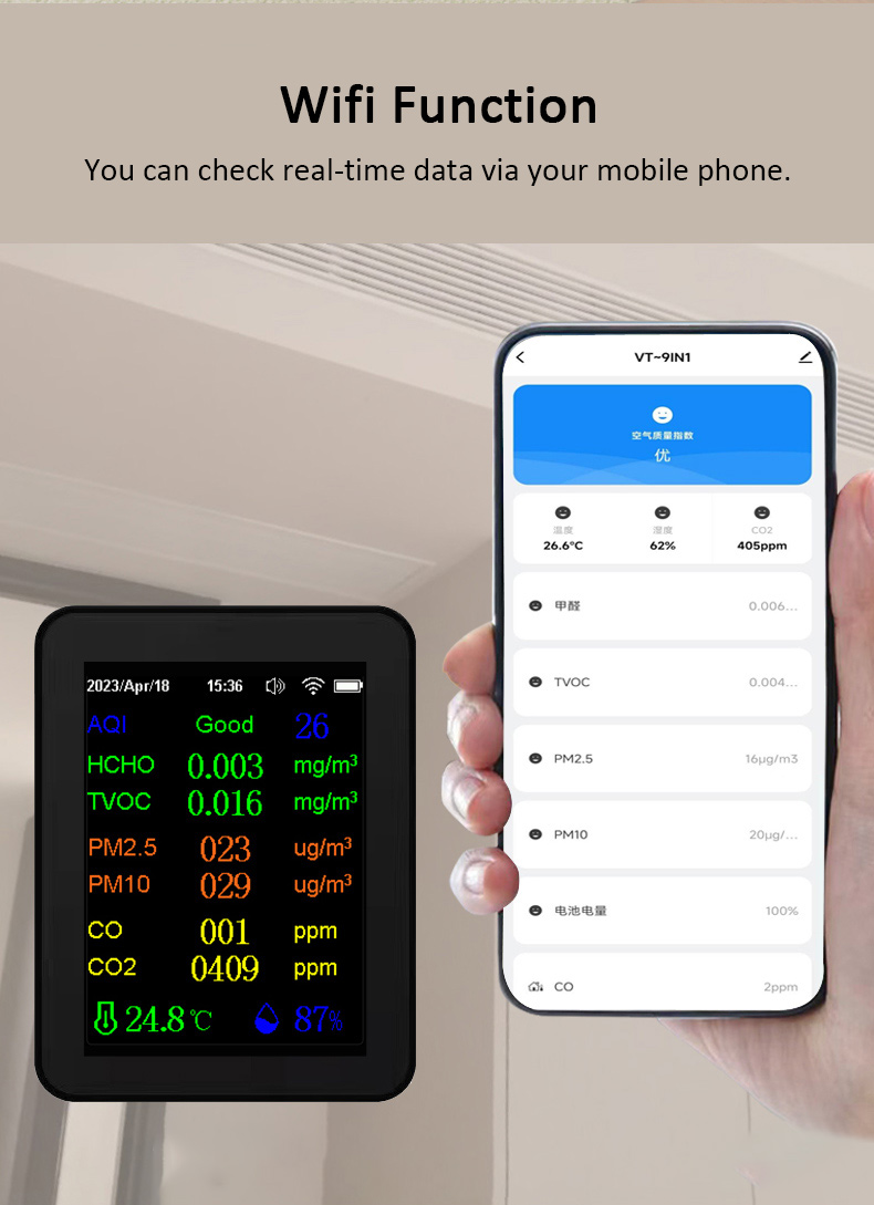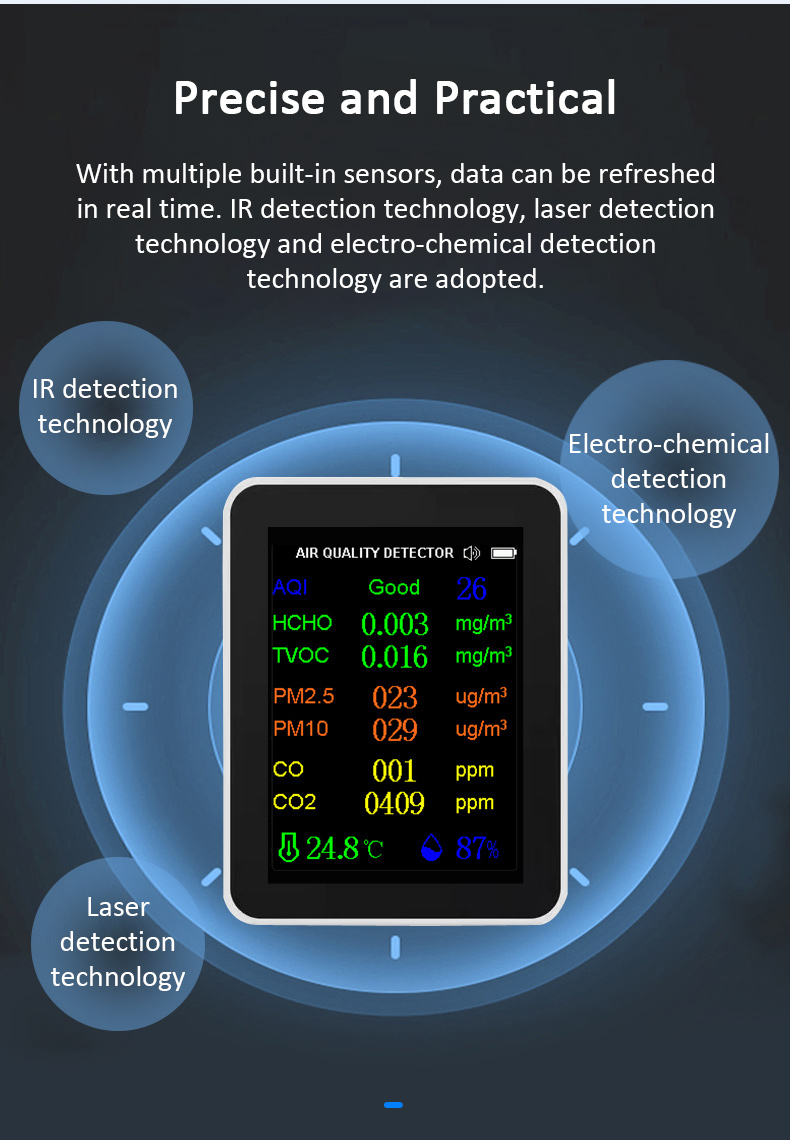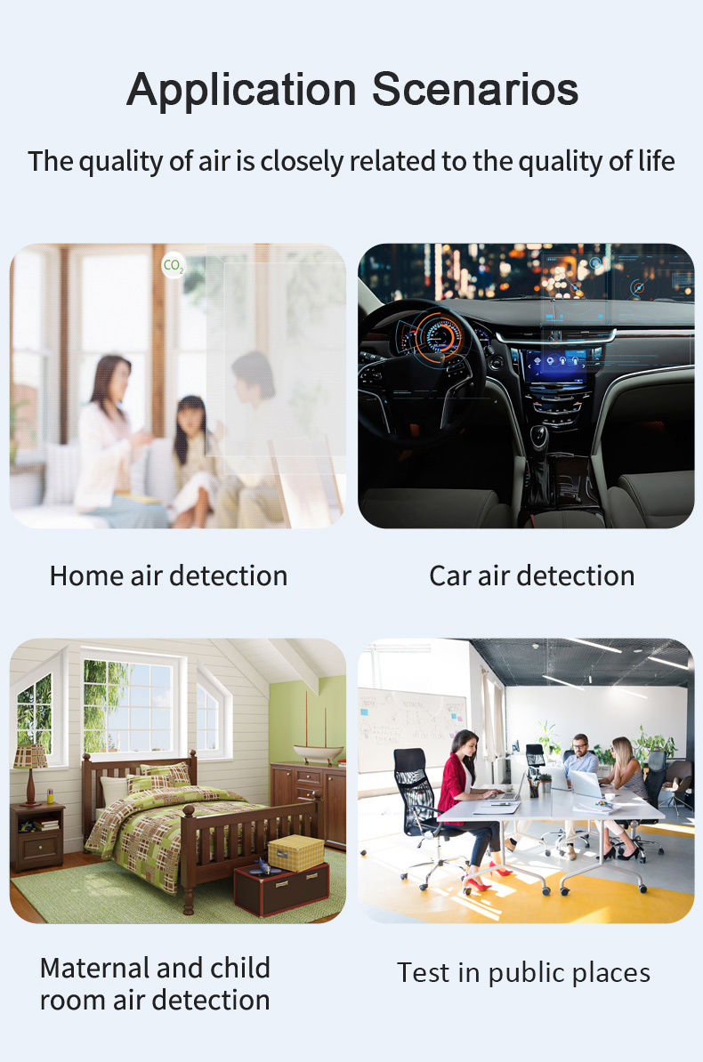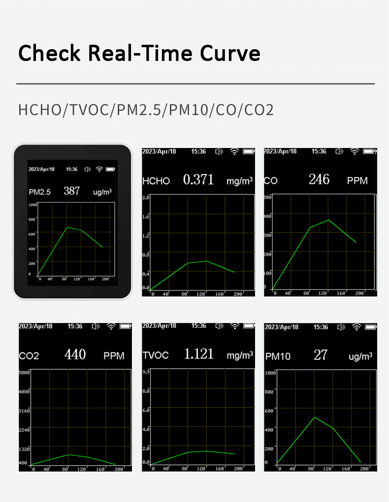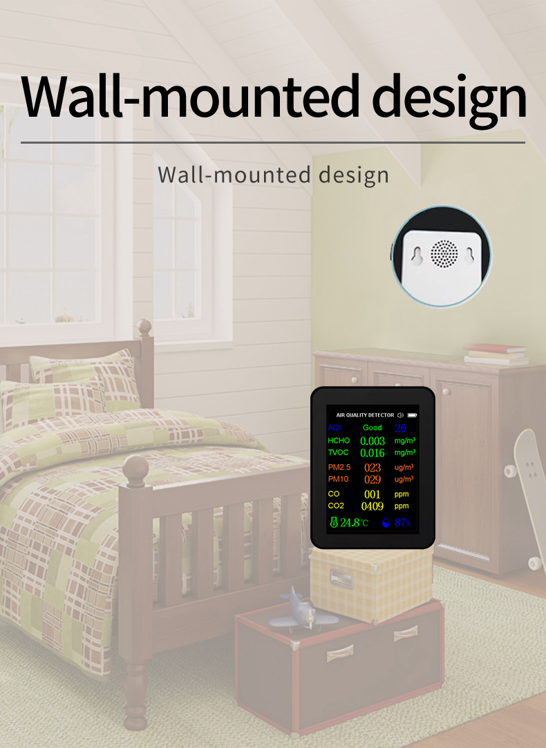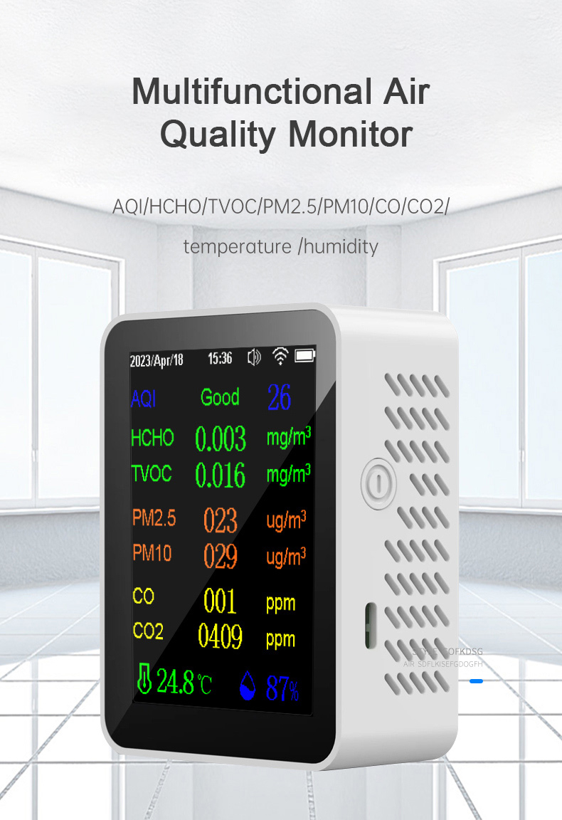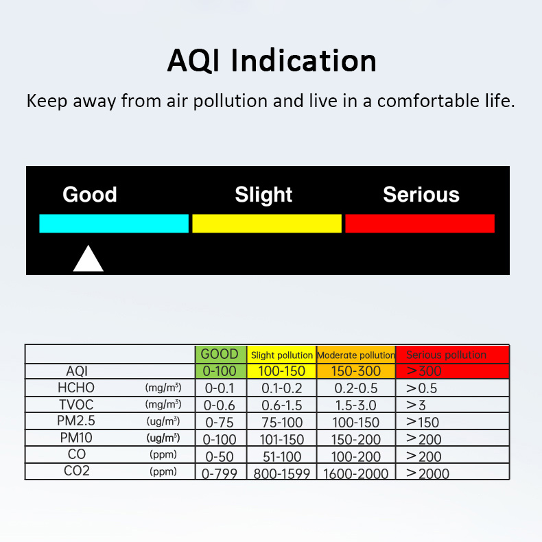 - Detection content: AQI/HCHO/TVOC/PM2.5/PM10/CO/CO2/Temperature/Humidity