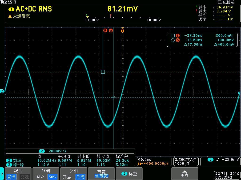 5.wv command: set the frequency value 1 (amplitude value). The format is: wvxxxx#, a total of 11 bytes. "xxxx" is 4 digits representing the amplitude control word, no dimension, only reflecting the DAC output current value of the DDS. For example, wv0001# means that the output current of the AD9912 is set to be relatively small, about 280mVpp. Wv1023# indicates that the output current of the AD9912 is set to be relatively large, about 1100mVpp.