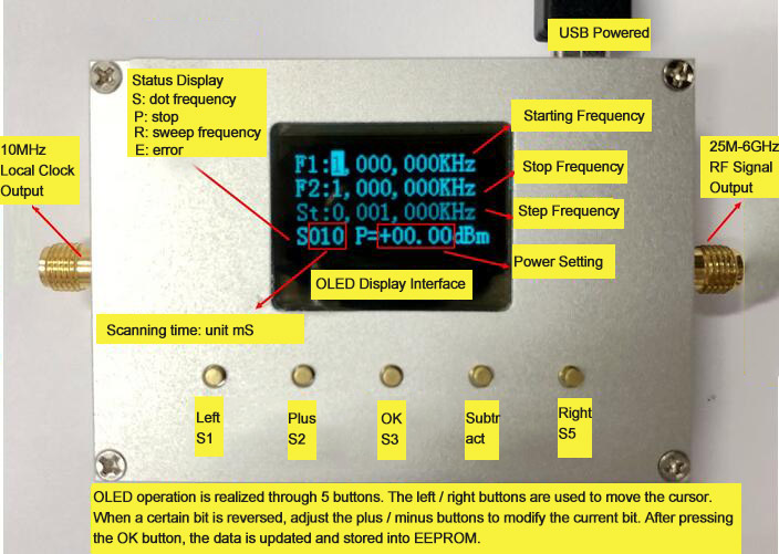 4.Functions: the left SMA port, the default delivery mode is 10MHz, plus or minus 0.1ppm temperature compensation clock source output, can also be configured as an external clock input mode (need to contact the owner to modify); the SMA port on the right can be set as a point-frequency RF source / sweep source by pressing the button / host software, and the amplitude can be controlled numerically.