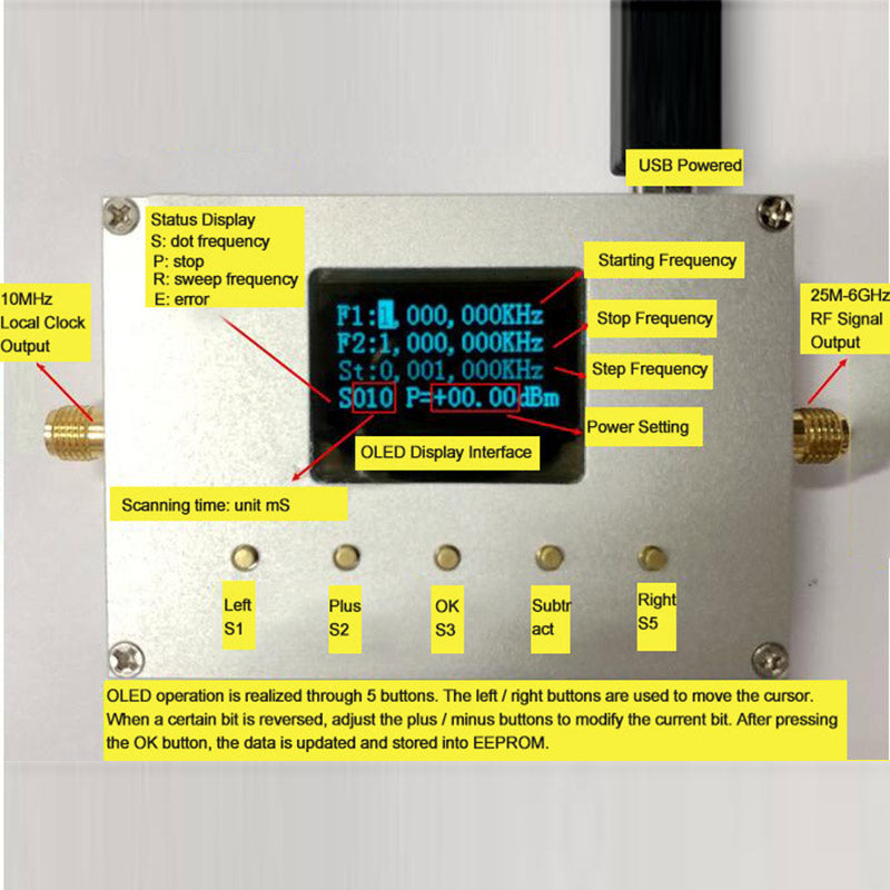 -The frequency range included in the smart signal generator is ADF4351 (37.5MHz-4.4GHz); minimum frequency step is 1KHz; with amplitude adjustment function, the maximum output amplitude in the range of LF to 2.5GHz is + 15dBm,and the maximum output amplitude in the 2.5GHz to 4.4GHz range is 5dBm (refer to the actual measured value for details).