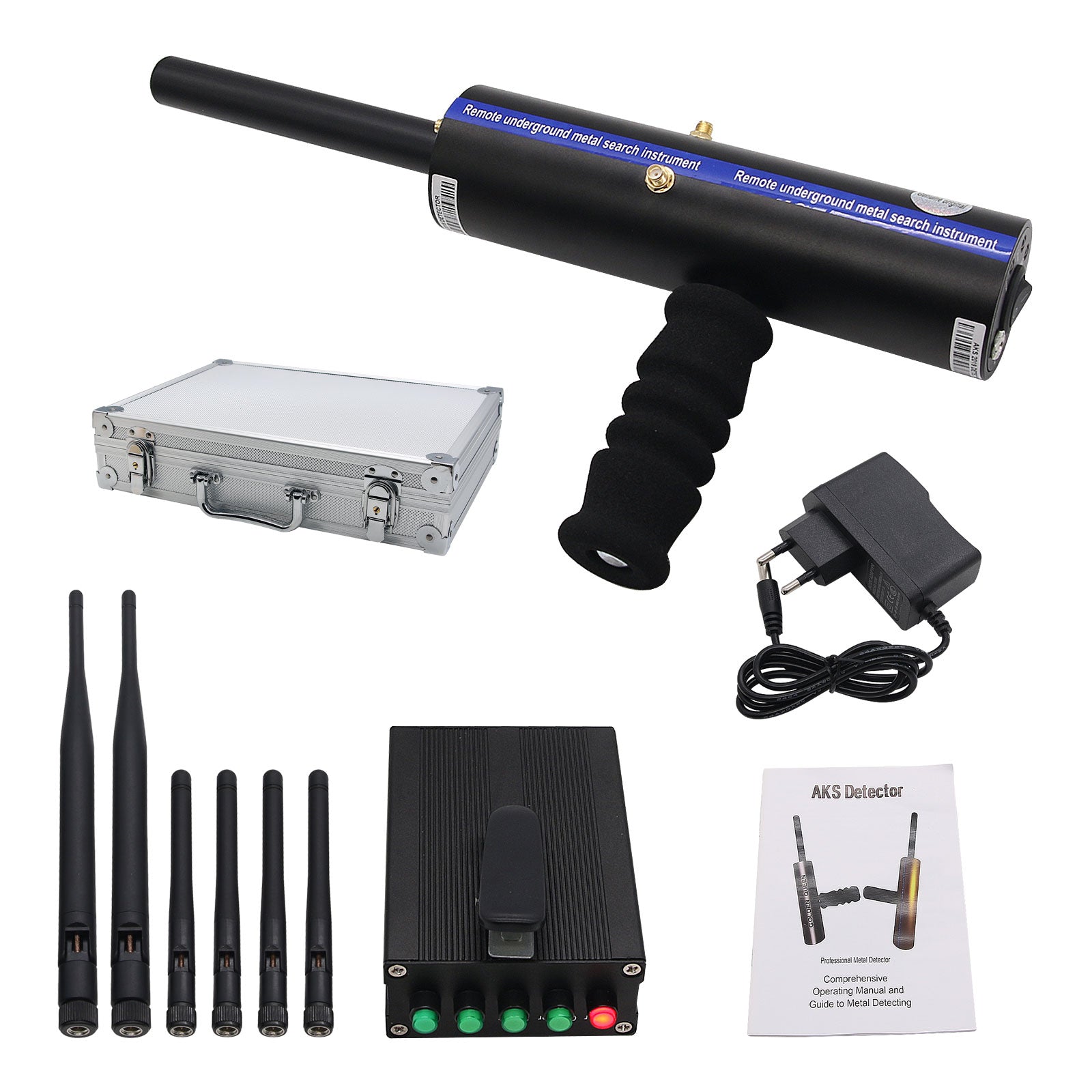 AKS Long Range Gold Metal Detector Gems Diamond Finder Black w/ Six Antennas Aluminum Carry Case