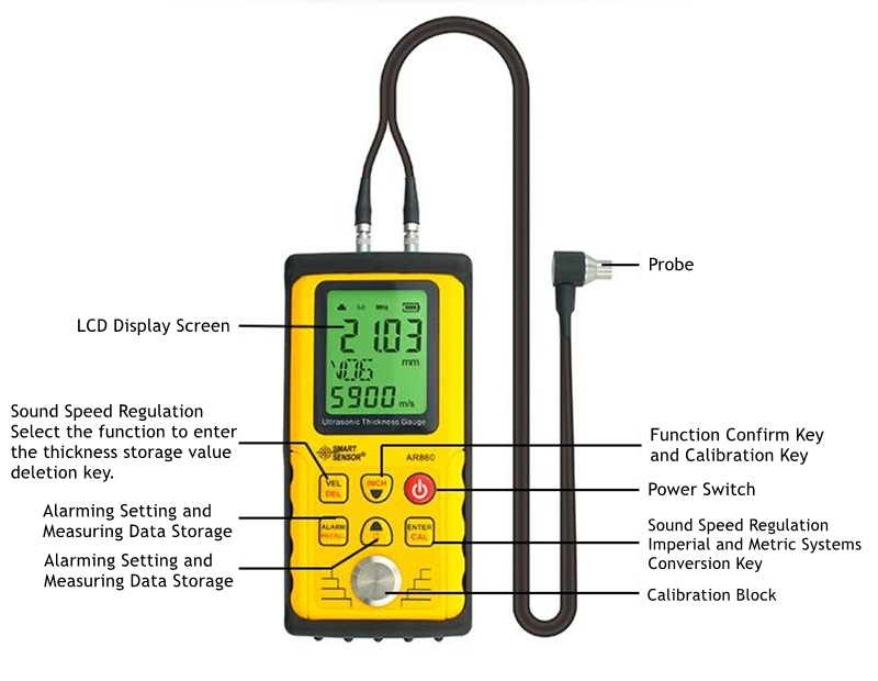 - Suitable for measuring the thickness of good conductors of metals (such as steel, cast iron, aluminum, copper, etc.), plastics, ceramics, glass, fiberglass, and any other ultrasonic waves, capable of testing any single high-density material!