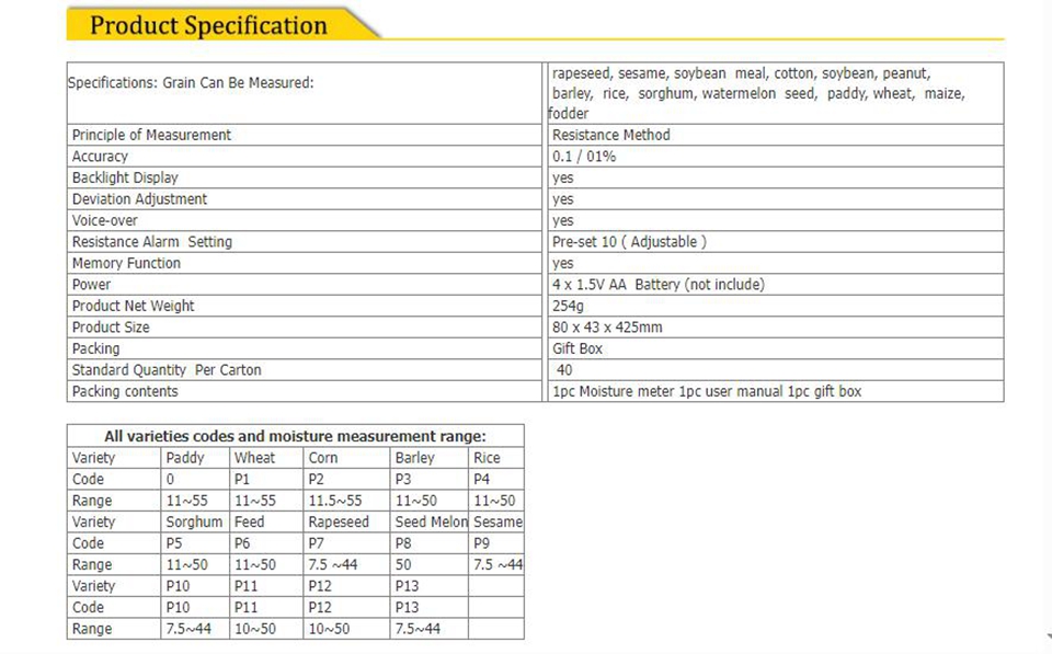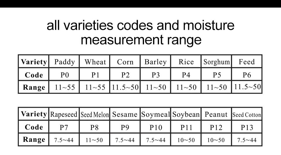 - Measurement 14 kinds: Paddy, Wheat, Corn, Barley, Rice, Sorghum, Feed, Rapeseed, Seed melon, Sesame, Soymeal, Soybean, Peanut, Seed Cotton.