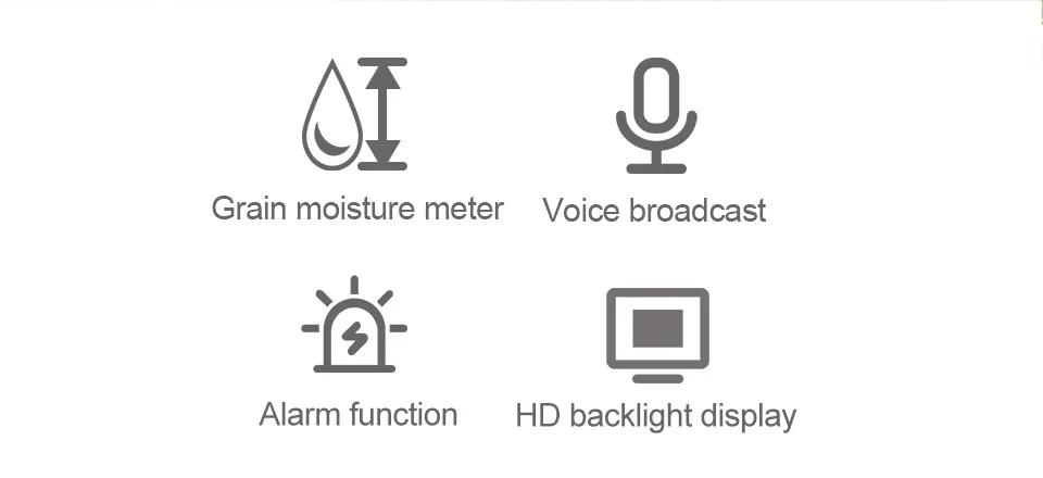 - Voice-Over: Instrument setting, testing, inspection, all accompanies by voice reminder. Language: English voice-over includes the following 4 modes: d1 = The moisture content readings, /d2 = High moisture content /d3 = Voice-over off, /d4 = bip-sound