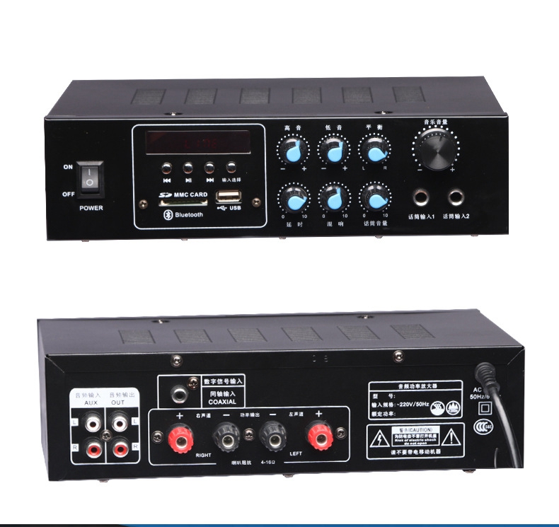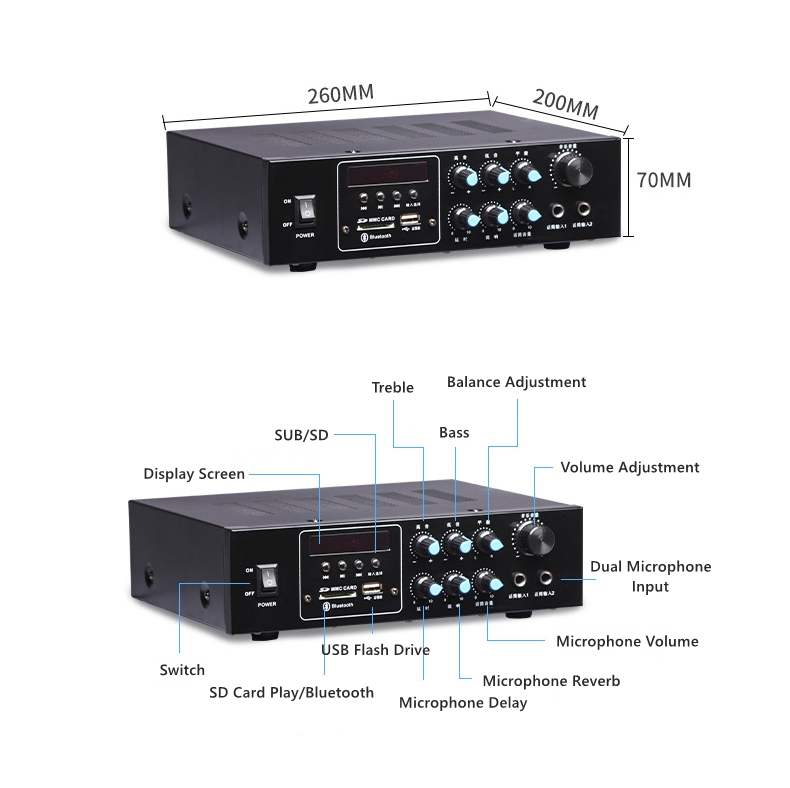 - Support USB flash drive, SD card, Bluetooth, optical, dual microphone input