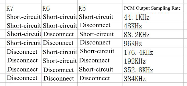 3.Set the sampling rate of PCM output mode through K5, K6, K7:
