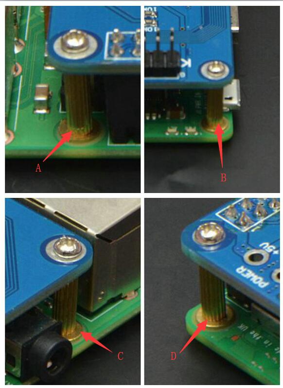 As shown in the figure below, you need to install gaskets under four copper columns A, B, C, and D (with gaskets, screws copper columns when shipped)