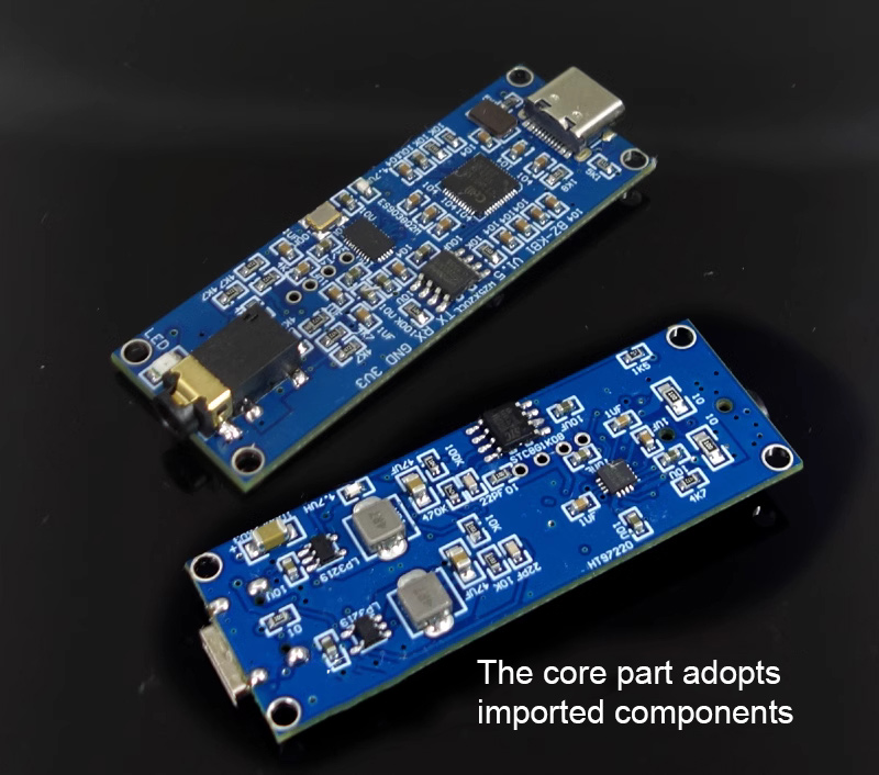 - The core solution is CT7601 + American ES9038Q2M high-precision decoder. The chip THD+N is 120dB, and the THD is as low as 0.001%. This is due to the 100M active low-phase noise crystal oscillator and the fully optimized PCB circuit design. The sound analysis is very well detailed, so it can drive regular headphones and small earbuds. In addition to connecting to a mobile phone, it can also be connected to a computer when used as an external USB sound card