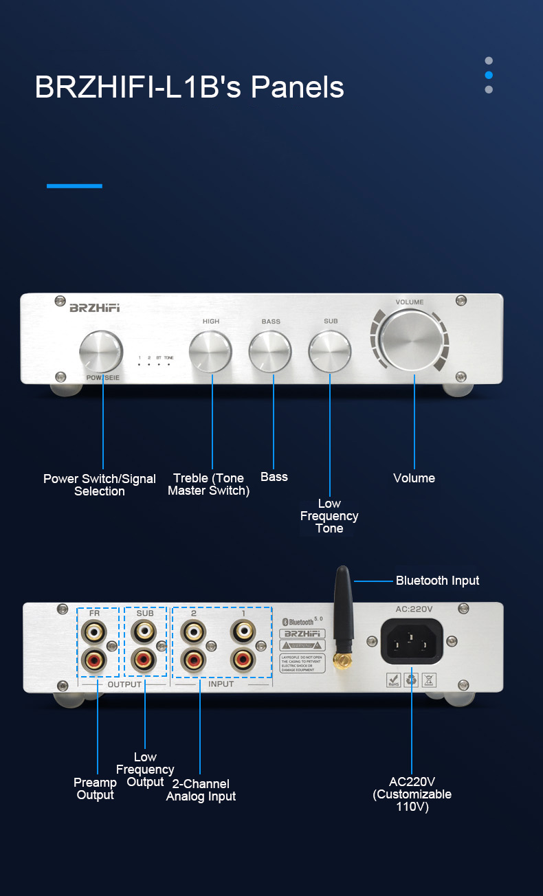 - Independent sound effect, HIFI sound quality. Solid and powerful sound line, knob switch and sound source selection LED signal channel indication. Humanized design, direct/tone can be turned on and off.