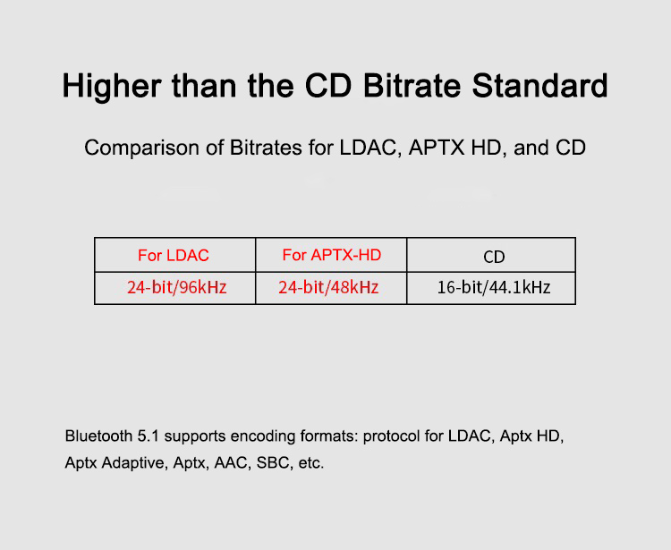 - Encoding formats supported by Bluetooth 5.1: protocol for LDAC, Aptx HD, Aptx Adaptive, Aptx, AAC, SBC, etc.