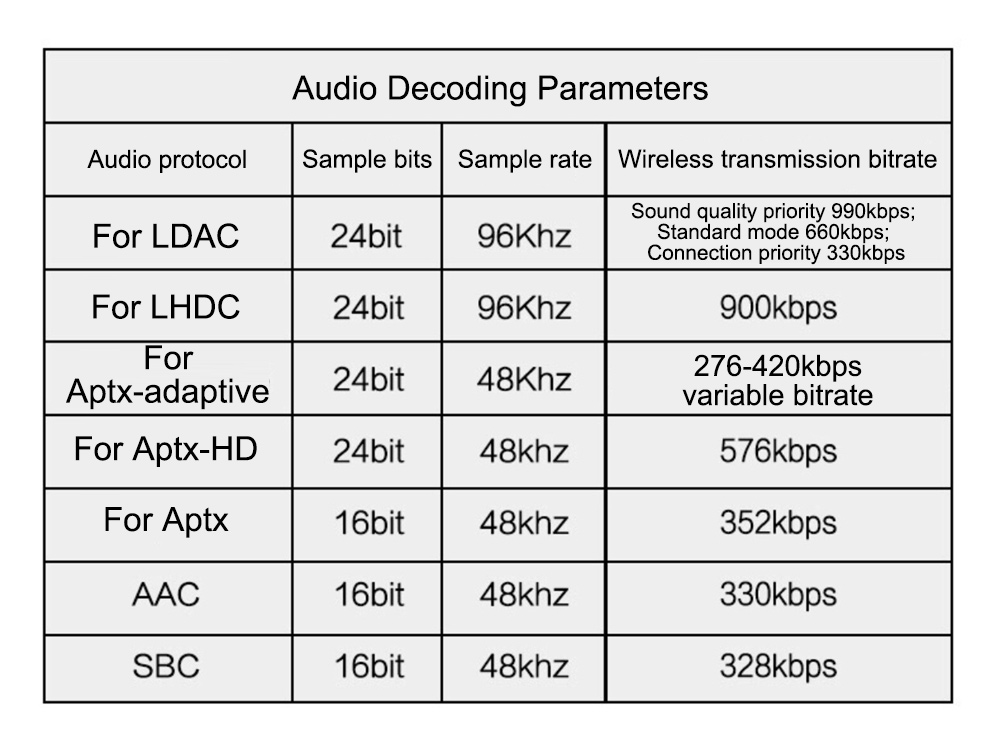 - Its Bluetooth Hifi sound quality is as good as the one by wired connection. It supports high-specification audio protocols such as for LDAC, APTX-ADAPTIVE, APTX HD, APTX and AAC. Its maximum transmission bitrate is 990KBPS. Support 96KHZ/32bit sample rate.