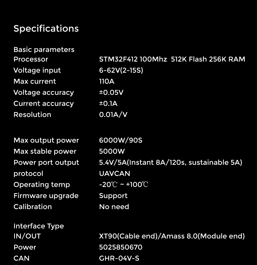 - Accurate power consumption estimates. Internally through real-time sampling of more than 100HZ and real-time statistics of power consumption / instantaneous power consumption, pass accurate power consumption information to the flight controller to achieve a safer and controllable flight.