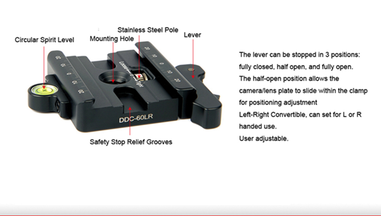 DDC-60LR Lever-Release Clamp, CNC cutting machine from light weight aircraft-grade aluminum, stain anodized surface finish for better abrasion and corrosion resistant. For all Arca-Swiss style plates.