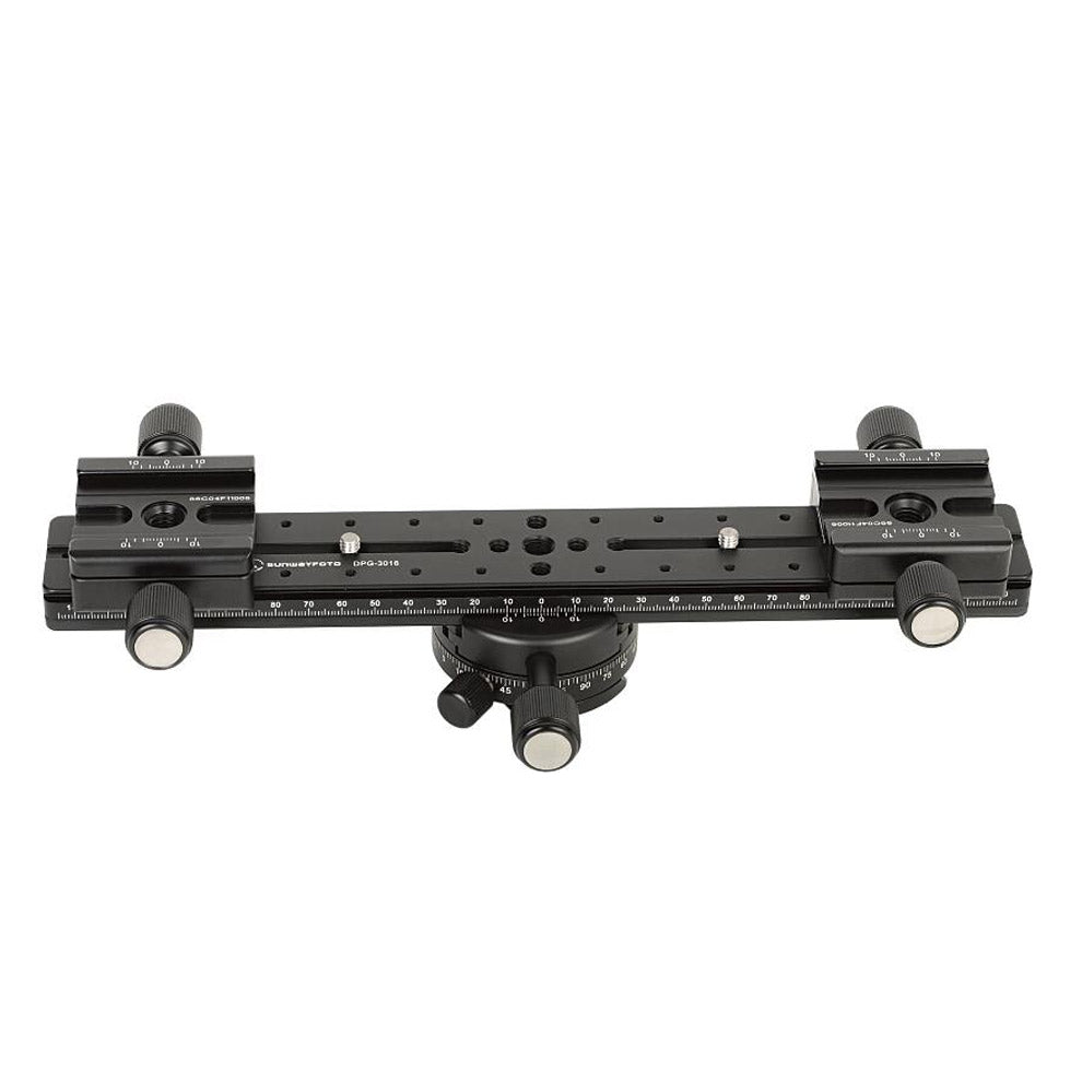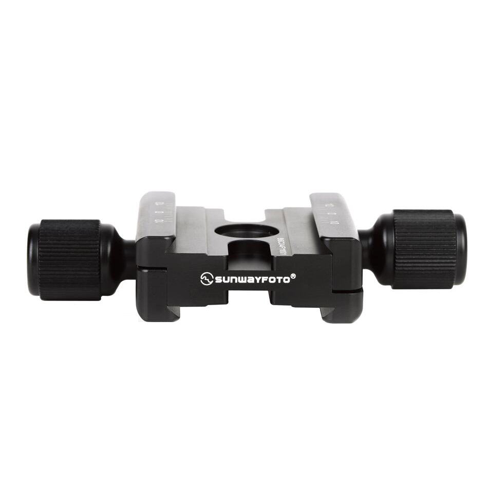 Mount your camera on the top clamp of the subtend clamp, at the same time, the bottom clamp can accept a multi-purpose rail, so that you can slide your equipment onto the rail. Then you can slide your equipment along the rail and without having to move your tripod.