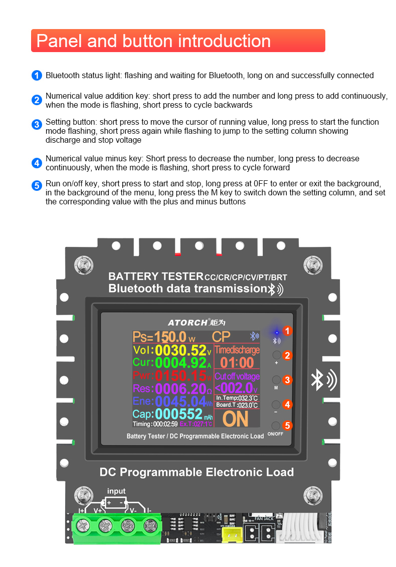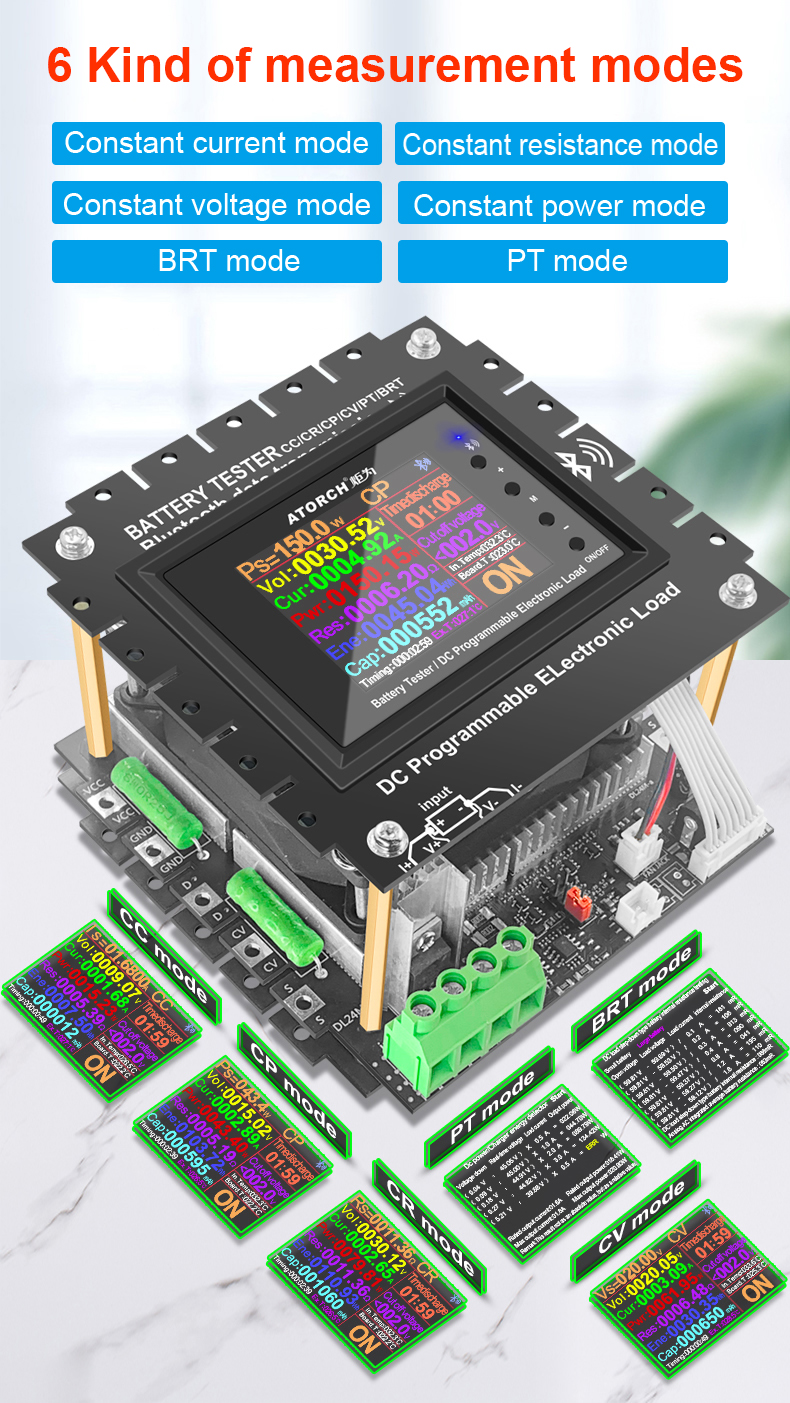 - Six powerful functions (constant current, constant power, constant resistance, constant voltage, intelligent one-key measurement of internal resistance, and intelligent one-key power supply test)