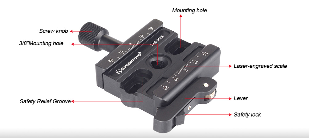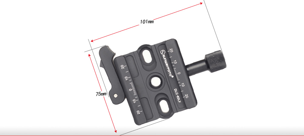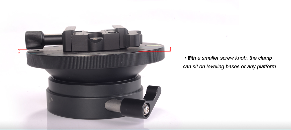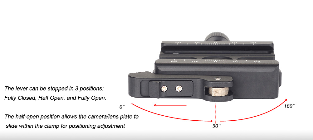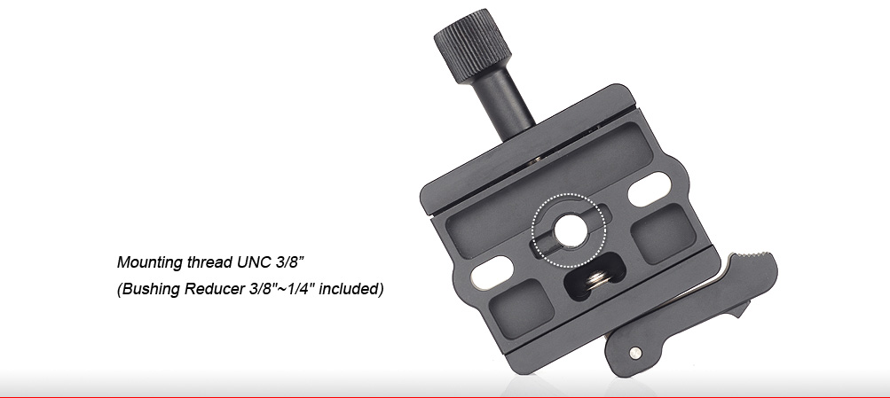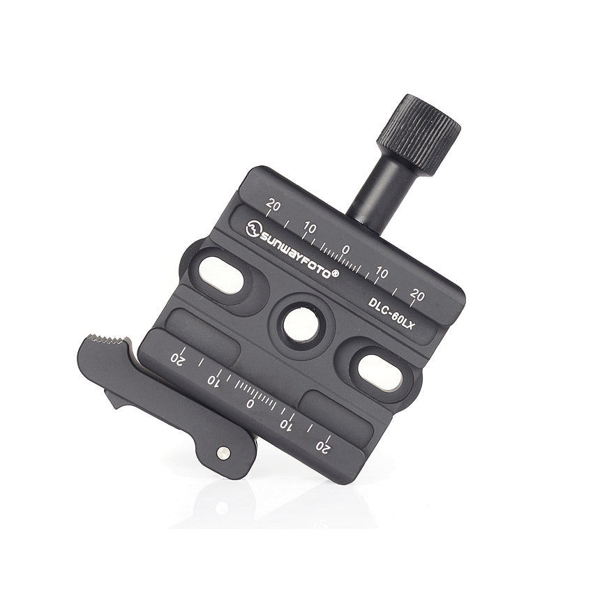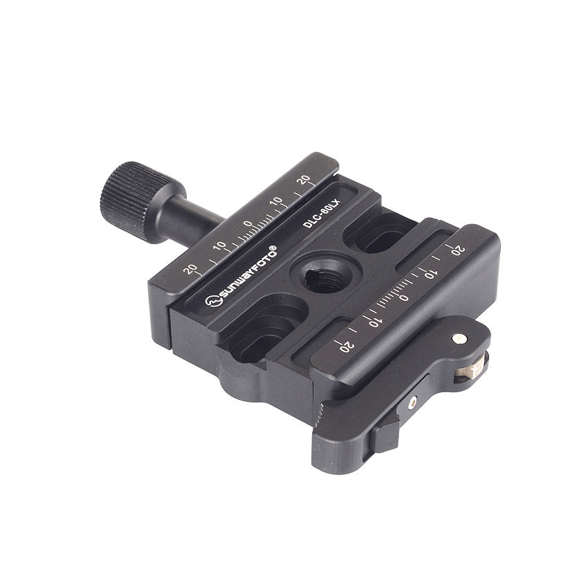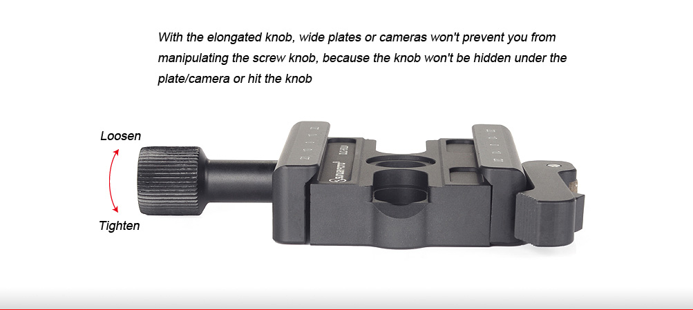 DLC-60LX Screw/Lever Combo Clamp, CNC cutting machine from light weight aircraft-grade aluminum, stain anodized surface finish for better abrasion and corrosion resistant. For all Arca-Swiss style plates.