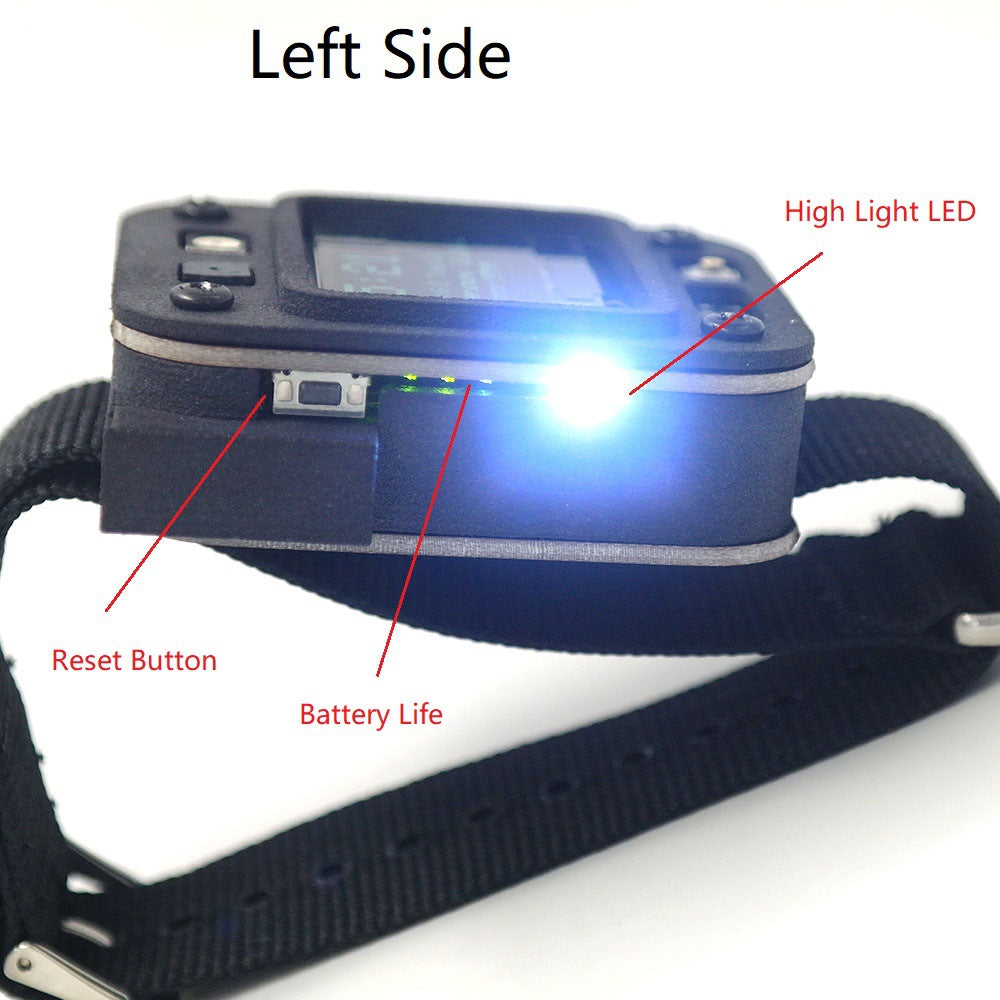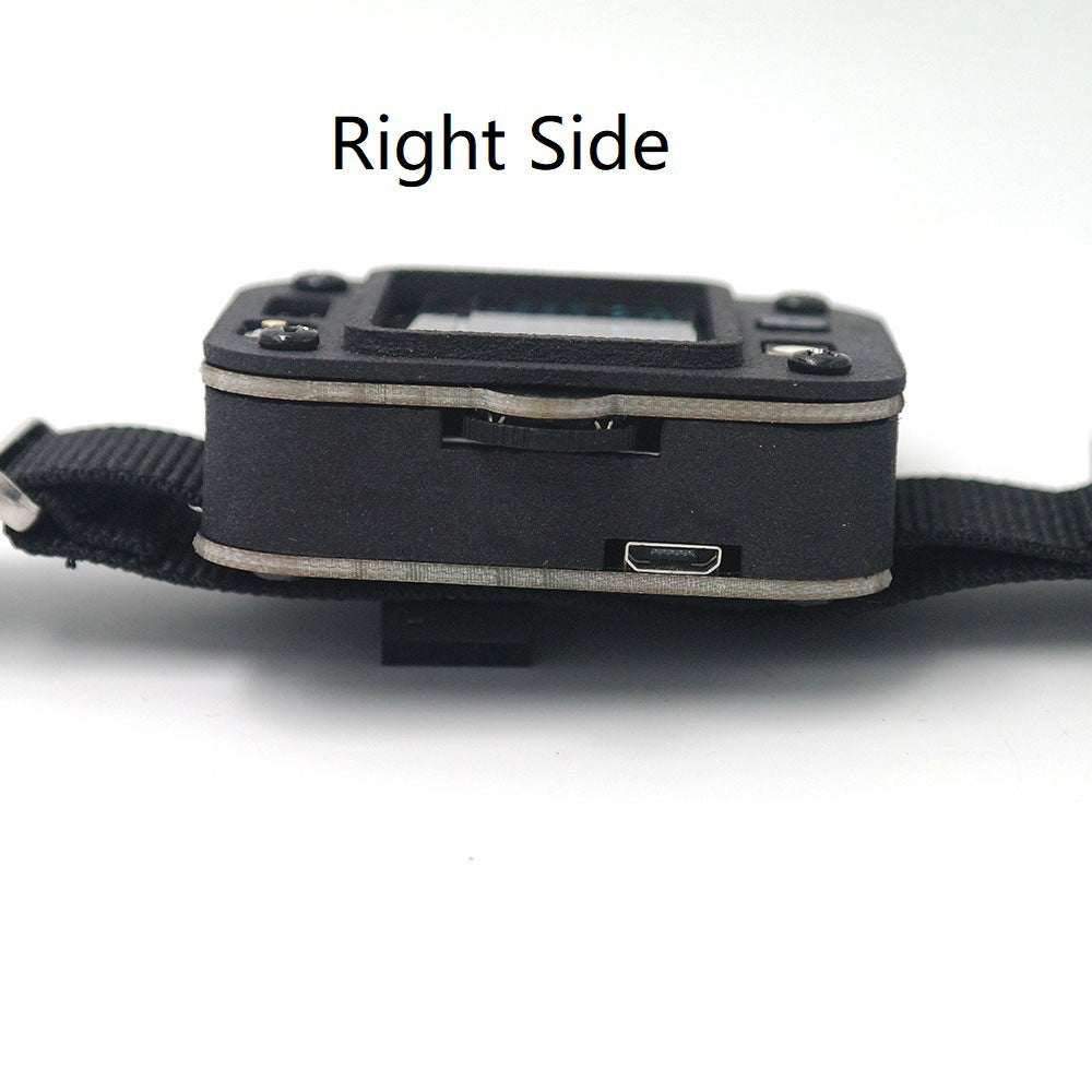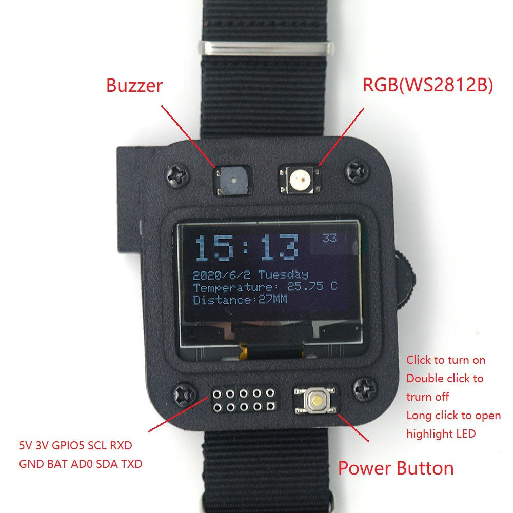 Push the switch upwards and the watch will detect distance between you and your target. If distance is less than 1m, buzzer will sound "B~" and RGB will turn RED at the same time. The distance sensor can only detect 0-1.2m range.