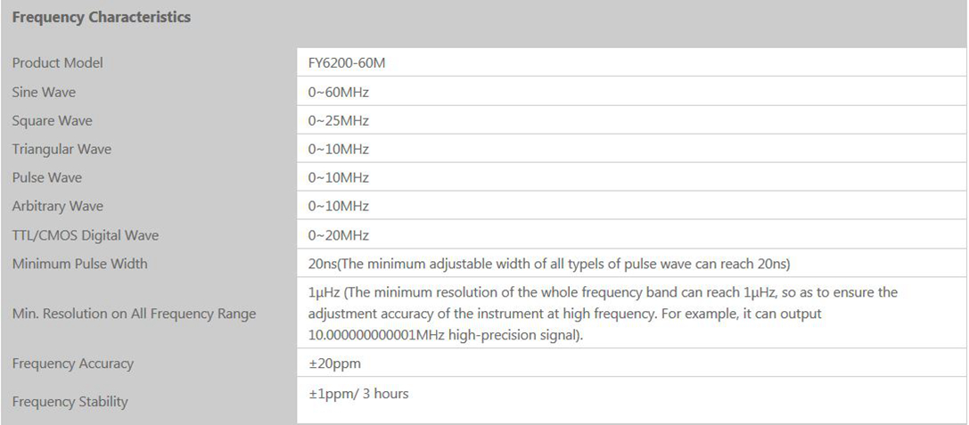 - High Frequency Accuracy: frequency accuracy can reach 10-6 orders of magnitude. And the full-range frequency resolution is 1μHz(0.000001Hz).