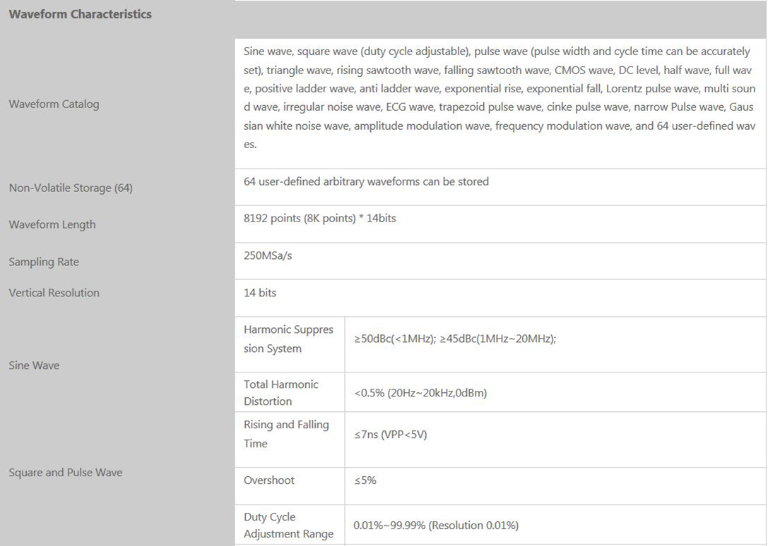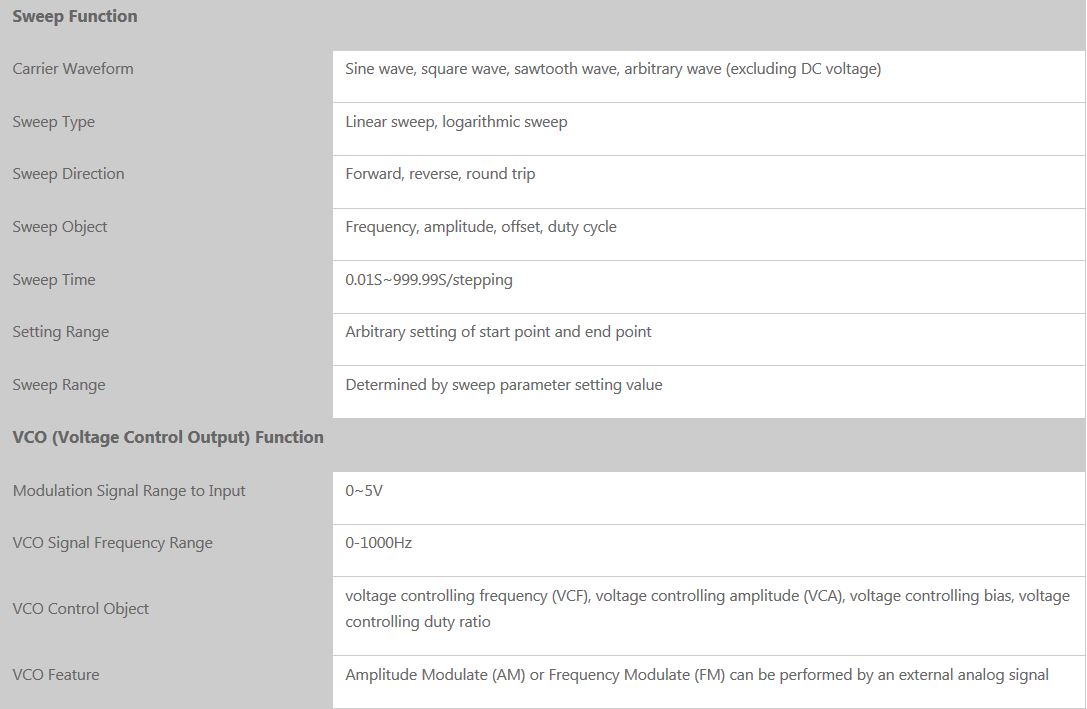- Scanning Function: it can scan the four properties of the signal: frequency, amplitude, offset, and duty cycle. And has two scanning modes: linear scan and logarithmic scan. The scan time can reach 999.99s, the start and end of the scan can be set arbitrarily.