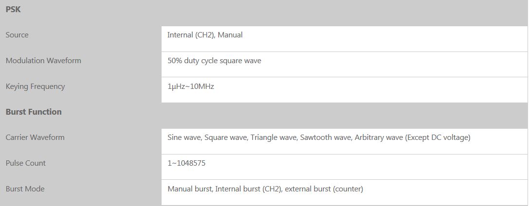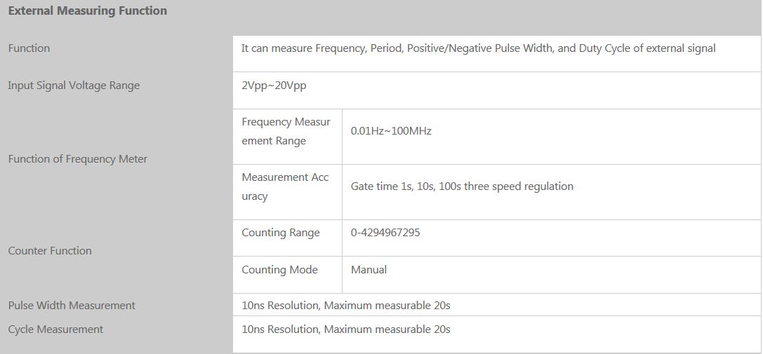 - Burst Output Function: there has manual trigger, internal CH2 trigger, and external trigger for your options, it can output 1~1048575 pulse trains.