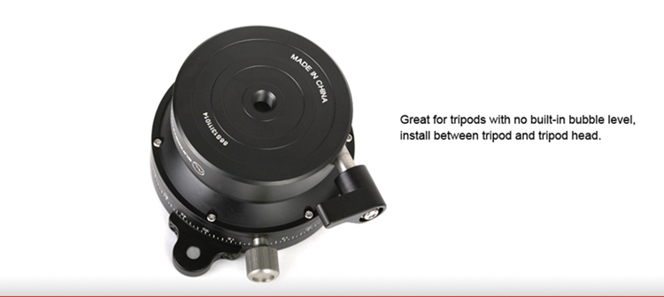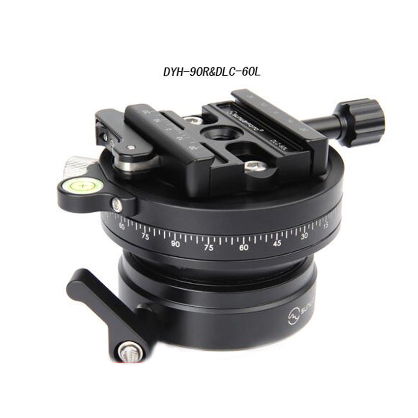 DYH-90Ri Leveling Base with a rotator for panorama shooting, CNC cutting machine from light weight aircraft-grade aluminum, stain anodized surface finish for better abrasion and corrosion resistant. Come with 90mm diameter platform, sturdy construction, up to 15kg max load capacity and super smooth fluid of adjust movement to +/-16 degree. It is ideal for medium/large format camera.
