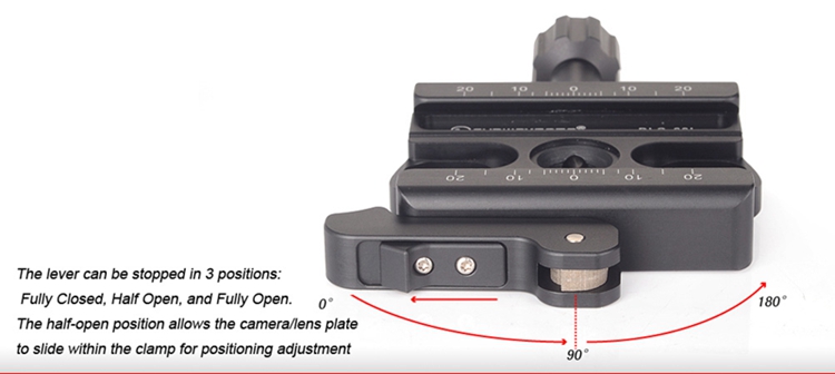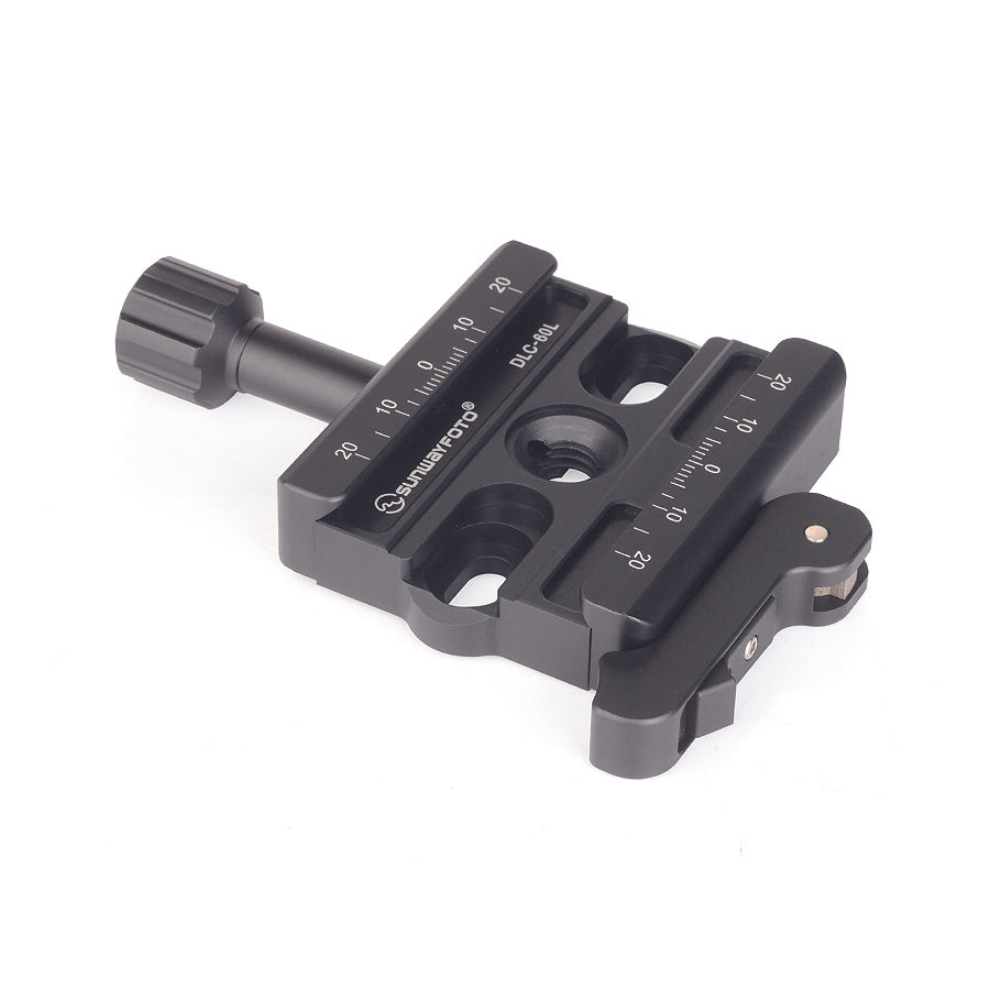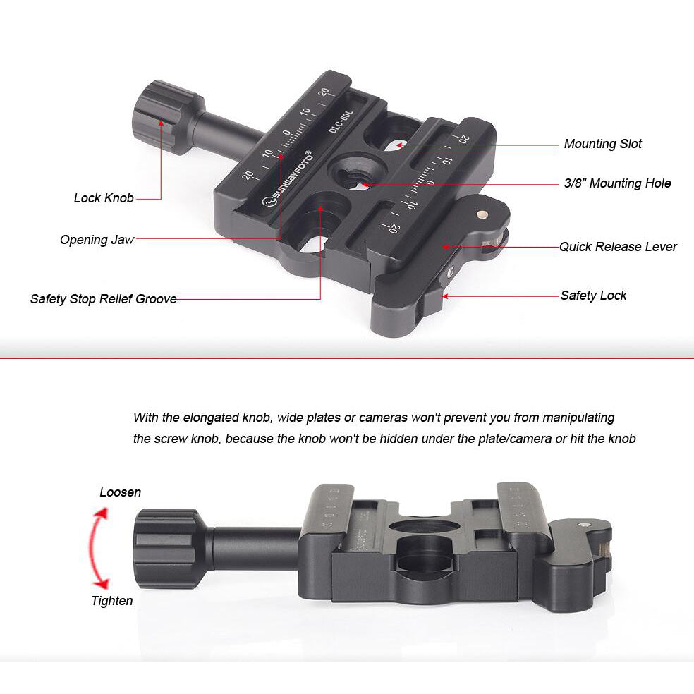 DLC-60L Screw/Lever Combo Clamp, CNC cutting machine from light weight aircraft-grade aluminum, stain anodized surface finish for better abrasion and corrosion resistant. Compatible with all plates for Arca-Swiss style.