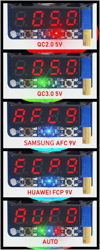 Short press the trigger button to switch between 4 modes, QC2.0, QC3.0, FCP/AFC and AUTO, In the same time, the LED indicator will light. When you switch mode, last mode trigger state will be closed.