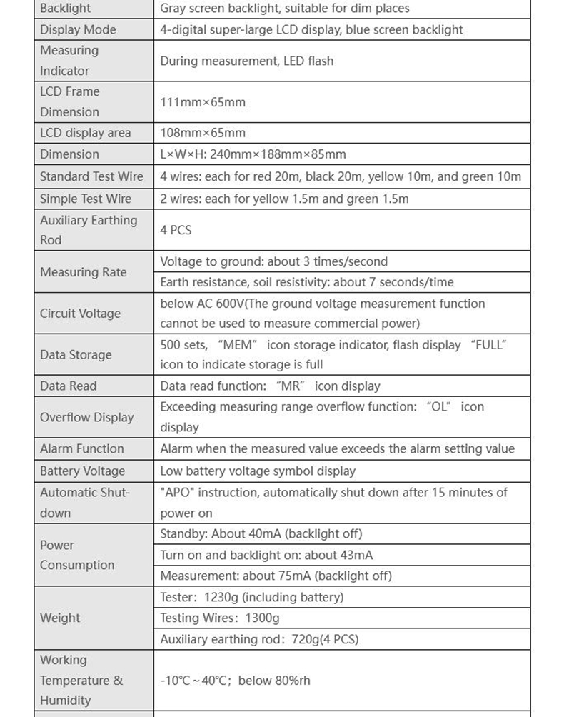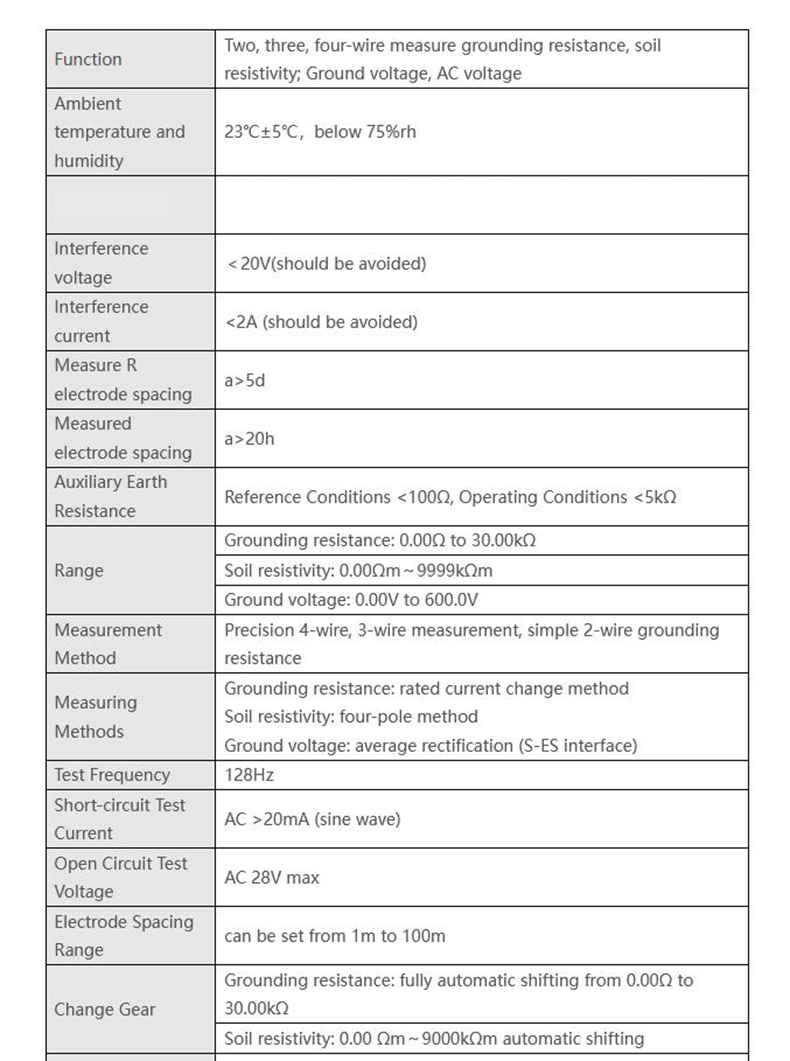 - Ground Resistance Soil Resistivity Tester also known as Four-Wire Ground Tester, Precision Ground Resistance Tester, etc. It is a commonly used meter for measuring grounding resistance. It adopts a large LCD gray-white screen backlight display and microprocessor technology to meet the requirements of two-wire, three-wire and four-wire test resistance and soil resistivity test. Suitable for telecommunications, electricity, meteorology, computer rooms, oil fields, power distribution lines, iron tower transmission lines, gas stations, factory grounding networks, lightning rods and so on. Instrument testing is precise, fast, simple, stable and reliable.
