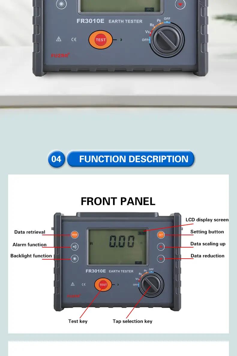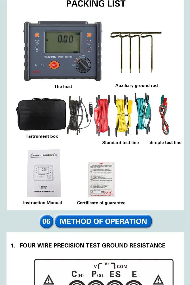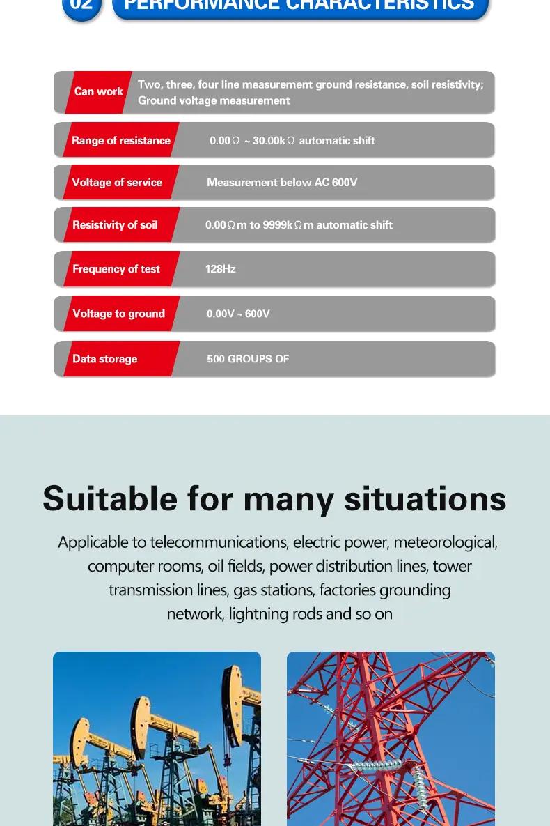 - The Ground Resistance Soil Resistivity Tester is controlled by the microprocessor and can automatically detect the connection status of each interface and the interference voltage and interference frequency of the ground network, and has the function of testing the auxiliary grounding resistance value. At the same time store 500 sets of data, resistance measurement range: 0.01Ω ~ 30.00kΩ, grounding voltage range: 0.01 ~ 600.0V.