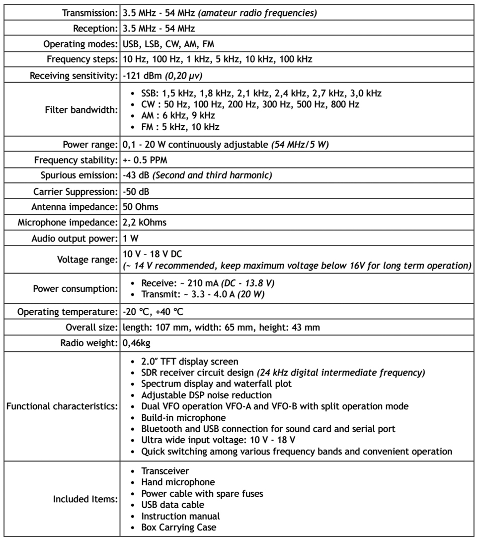 - Transmission: 3.5MHz - 54MHz (amateur radio frequencies)