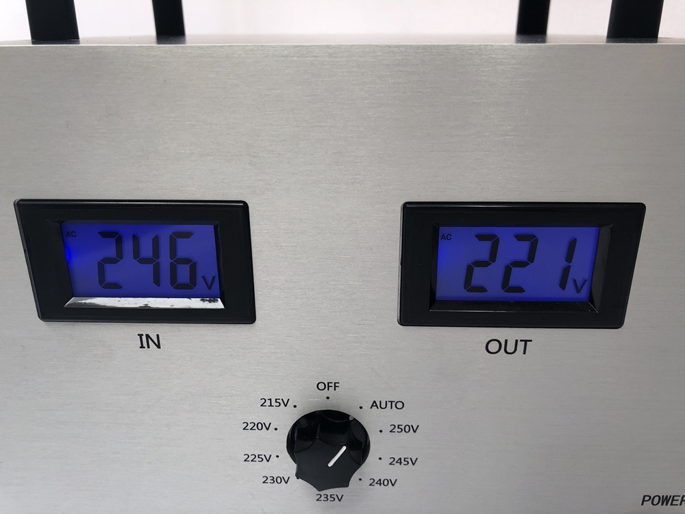 The left screen displays the input voltage, while the right screen shows the output voltage. The central dial features eight numbers ranging from 215V to 250V, corresponding to the taps on the transformer. For example, if the input display reads 245V, select 245V; if the input is 230V, then choose 230V. When powering up, users can freely adjust the voltage without any interruption to the power supply, ensuring the audio system remains completely unaffected and the speakers are free from any impact.