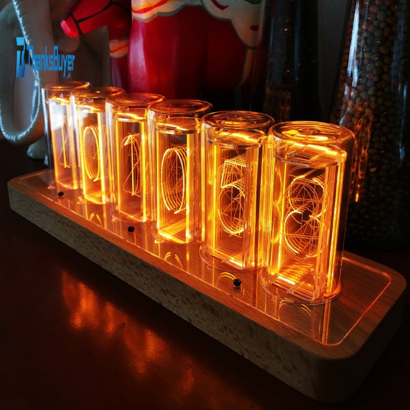 Glow Tube Clock LED Digital Solid Wood Tube Clock Adjustable Brightness Amber Color 6 Bit Tubes