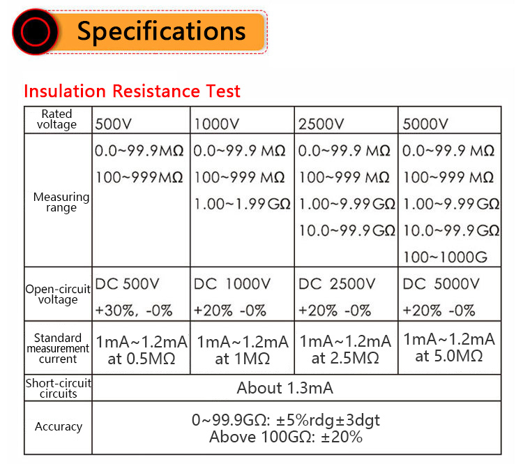 - Automatic ranging: Higher Range: 1000 Count. Lower Range: 95 Count (on Insulation Impedance Range Only)