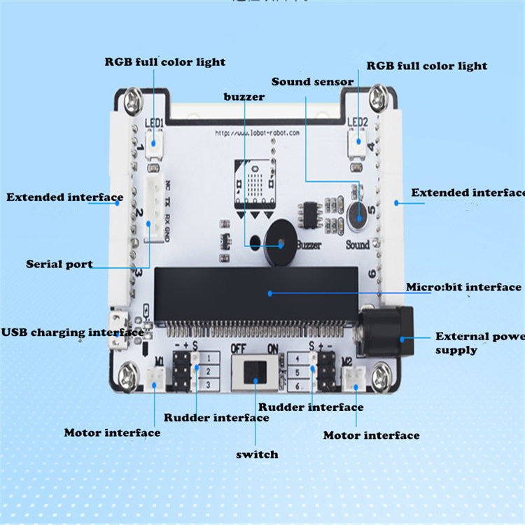 - Output: Buzzer, RGB colorful light, ports for 2 motors, ports for 6 servos and 5x5 LED dot matrix