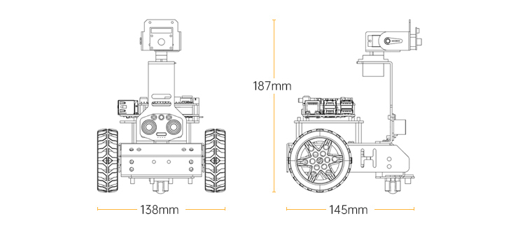 - Preset five smart play methods to make programming learning more interesting. Can be used for color tracking, face tracking, automatic obstacle avoidance, finger recognition, body remote control.
