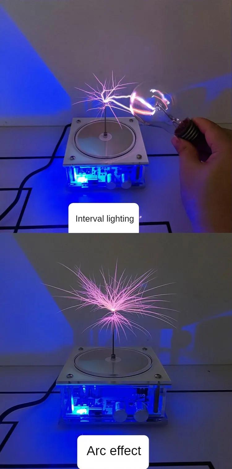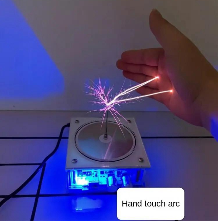 - Hand touch arc: This flat Tesla coil has a high working frequency and low power, which causes the arc to have a skin effect, so even if touched by hand, there is no harm.