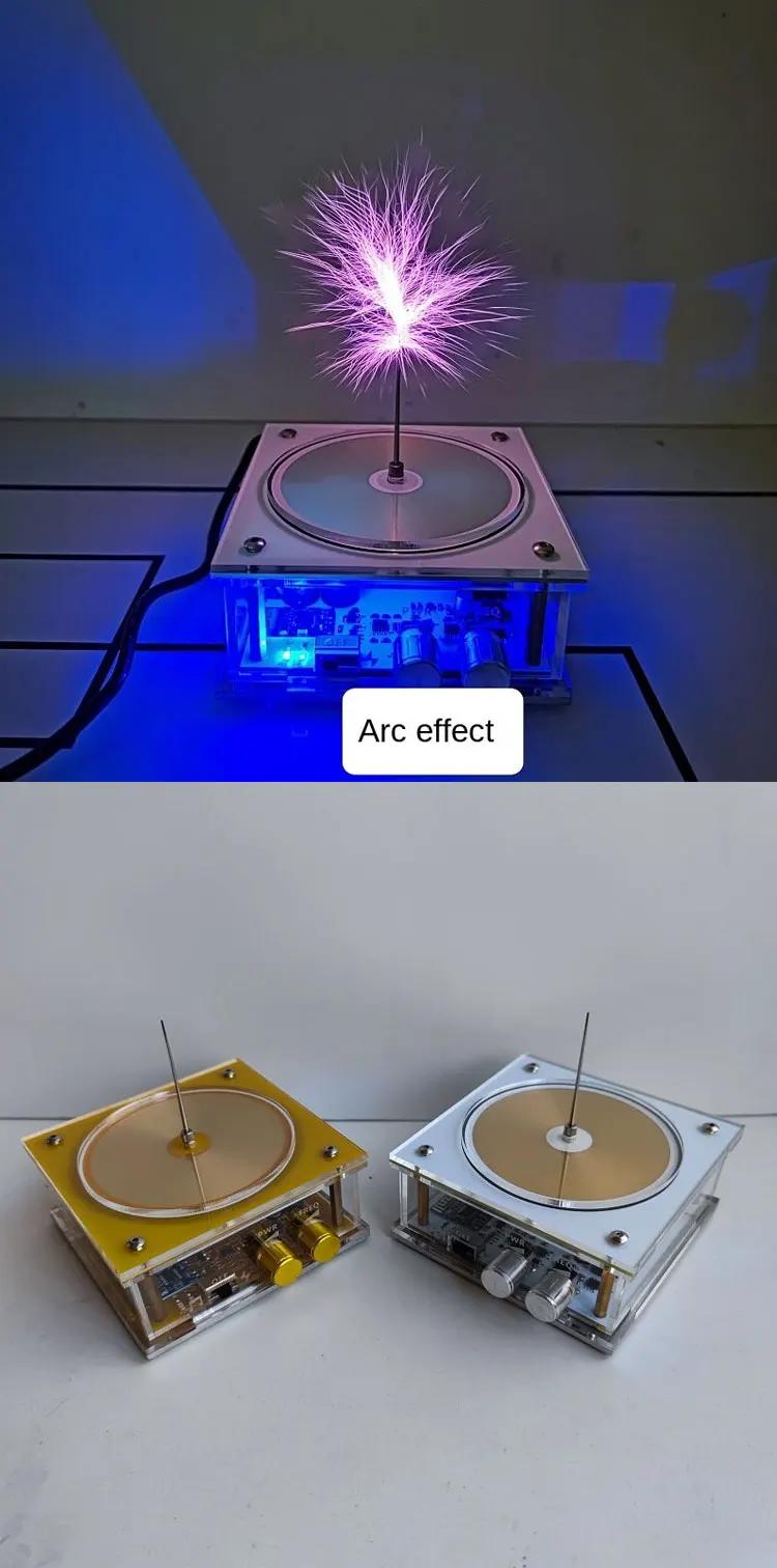 - This is a flat Tesla coil that can emit a 10cm long thin arc and can be touched, light up from space, and play music.