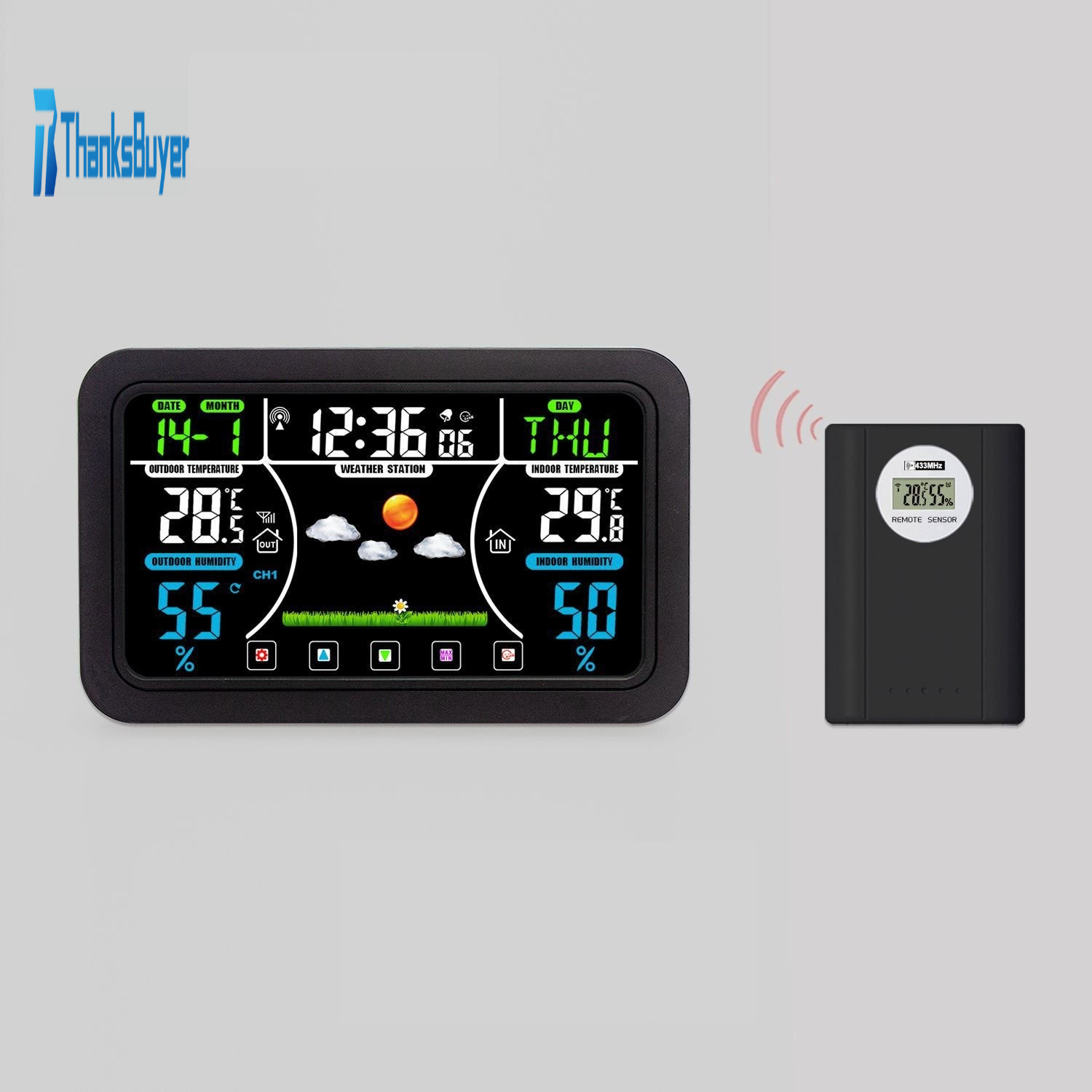 - It features a color display screen that shows the date, time, weather forecast, day of the week, indoor temperature and humidity, as well as outdoor temperature and humidity.