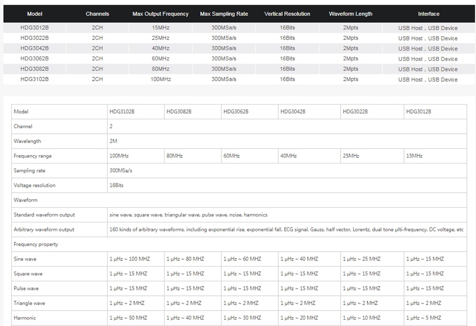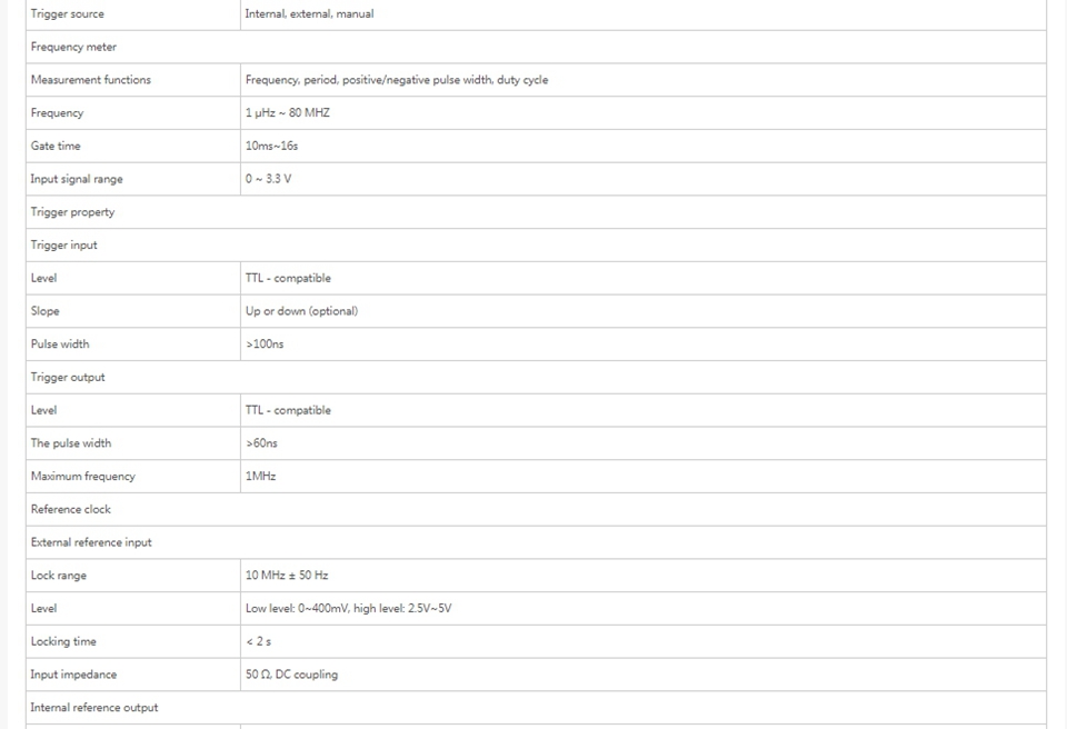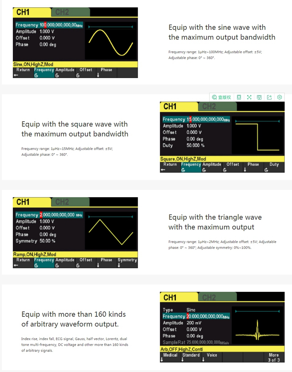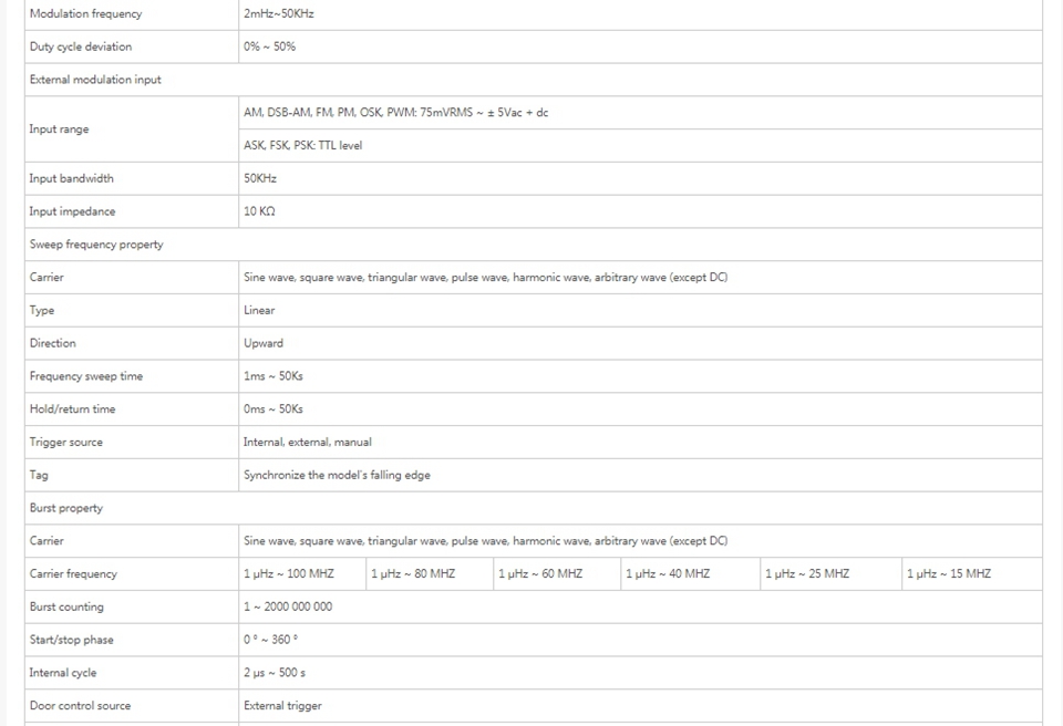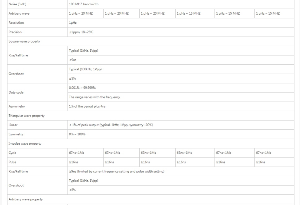 - Frequency range: 1μHz ~ 100MHz / 80MHz / 60MHz / 40MHz / 25MHz / 15MHz.