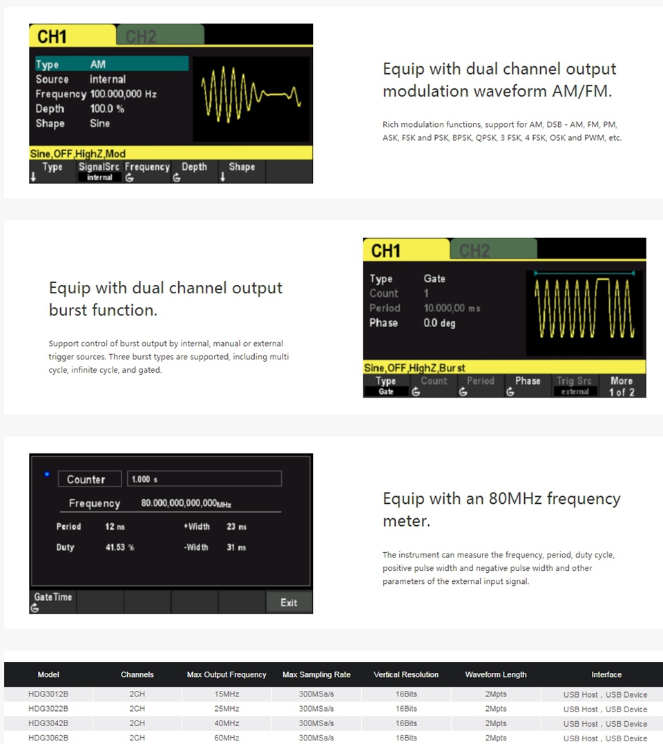 - HDG3000B sets arbitrary waveform generator, pulse generator, function generator, harmonic generator, frequency meter 5 functions in one. It uses the DDS (Direct Digital Synthesizer) technology, and can generate stable, pure, and low-distortion output signal. Humanized interface design and keyboard layout give users extraordinary experience. Rich configuration interfaces can easily achieve computer control of the instrument, which provides users with more solutions for measurement.