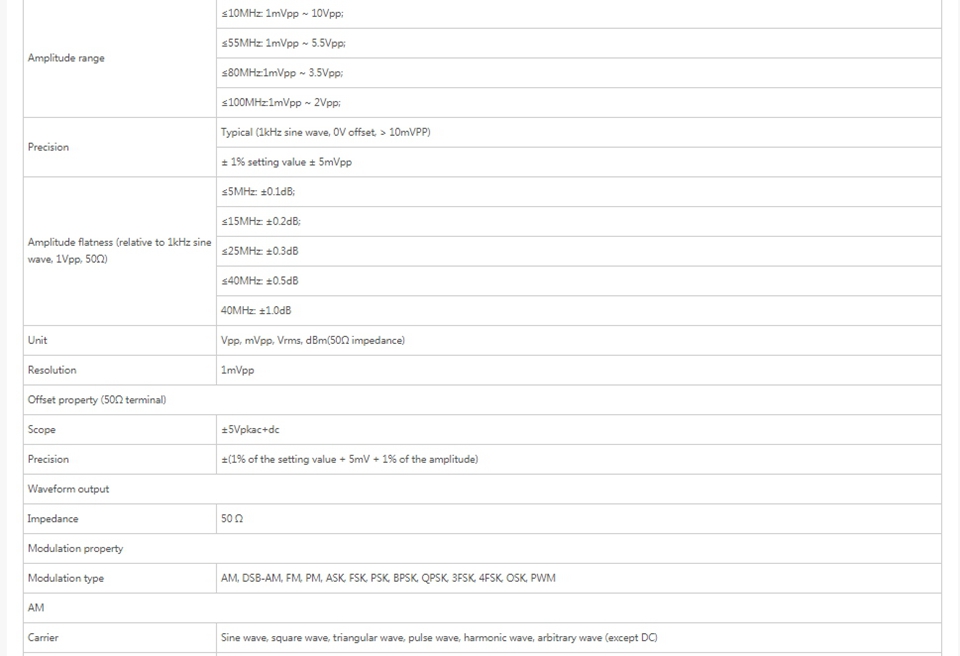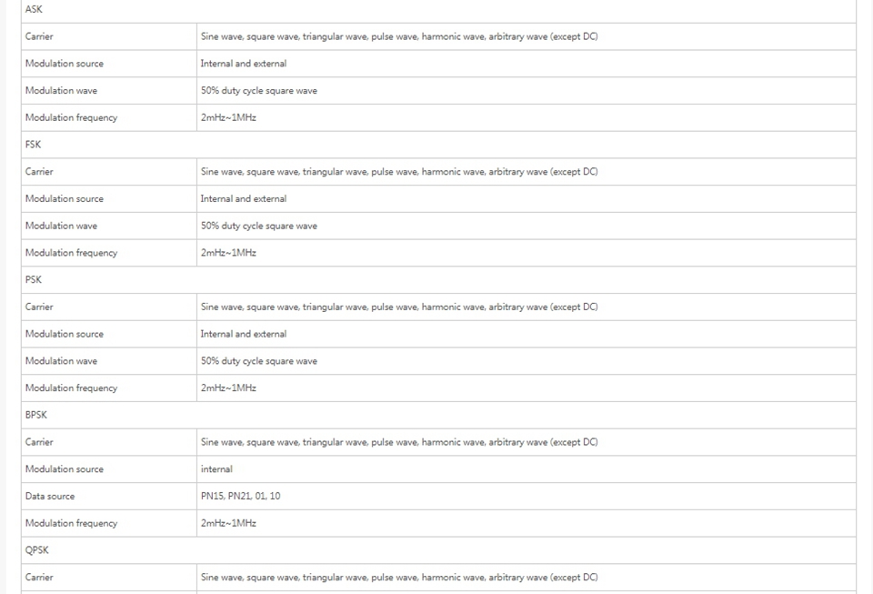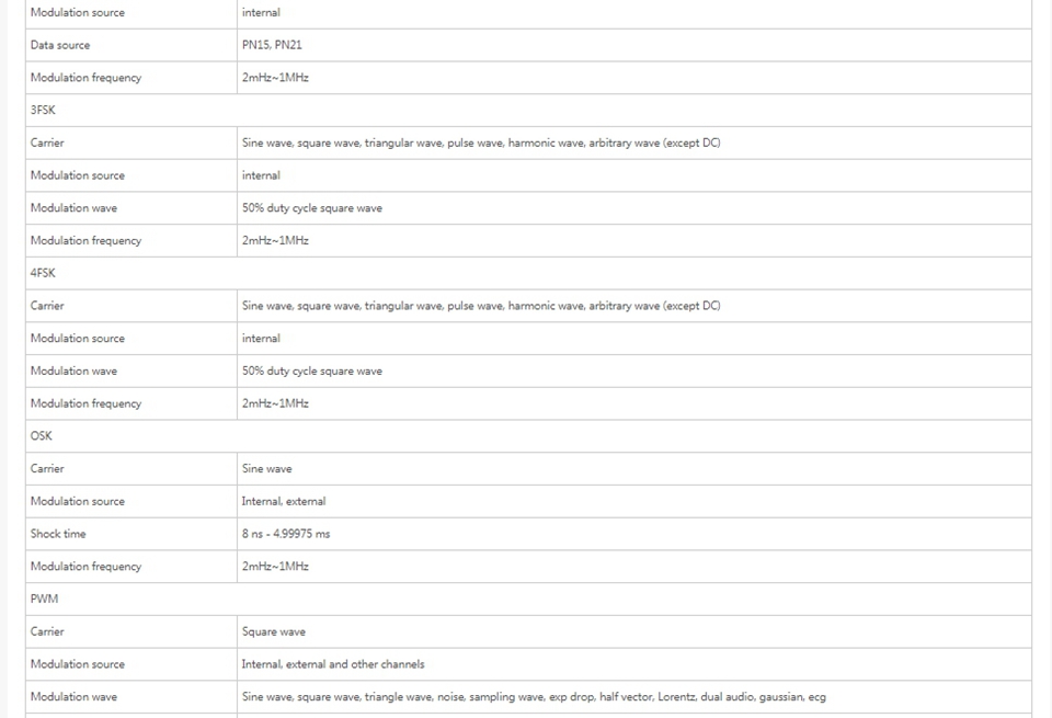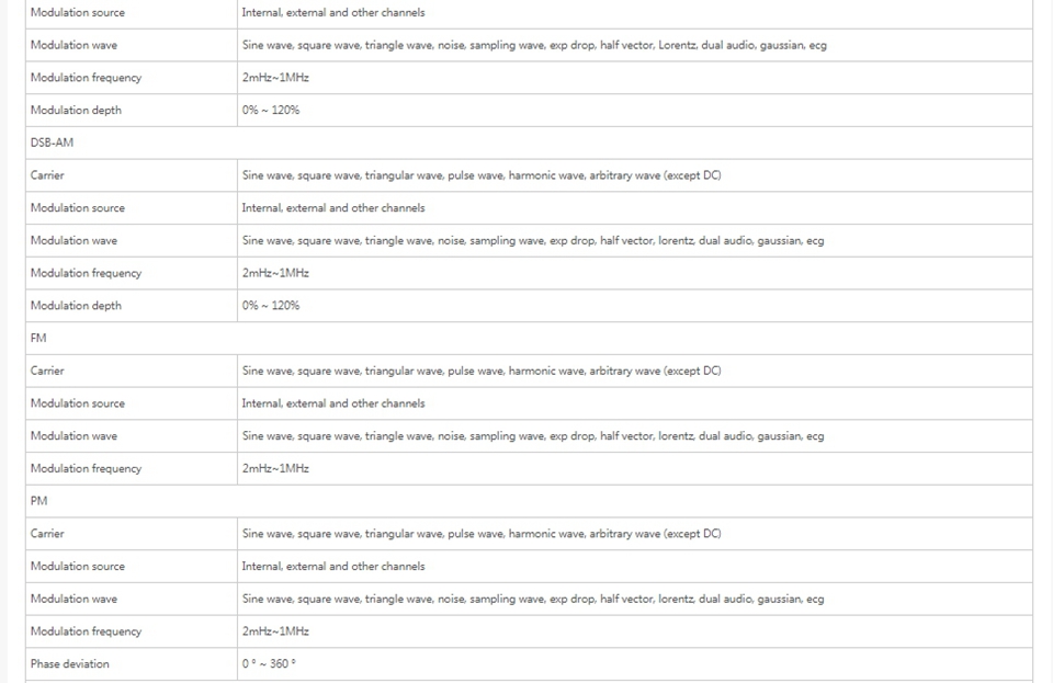 - Rich modulation function, support for AM, DSB - AM, FM, PM, ASK, FSK and PSK, BPSK, QPSK, 3 FSK, 4 FSK, OSK and PWM, etc.