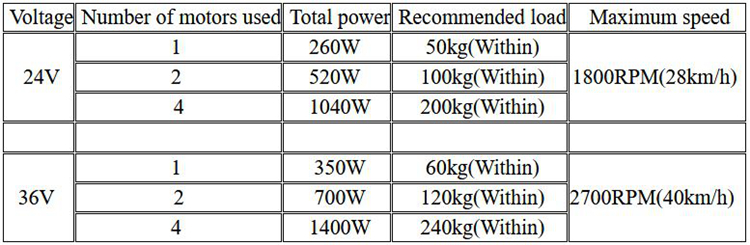 A. The motor load weight listed in the above figure refers to the use of 1, 2, and 4 motors as the driving wheels of the carrier. When the carrier starts at a standstill, the speed control accelerator (push rod or knob) is added to maximum, the maximum weight that can be driven on the carrier.
