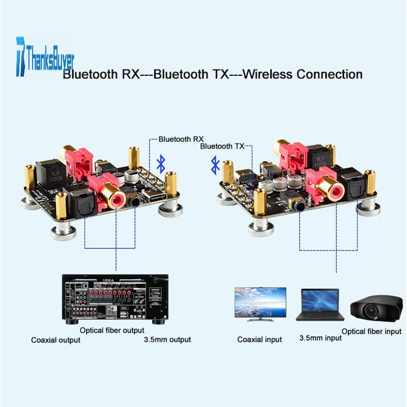 - Highly integrated 5.0 chipset Bluetooth receiving, transmitting, coaxial, optical fiber input, output 3.5 mm input and output functions in one. HiFi sound quality.
