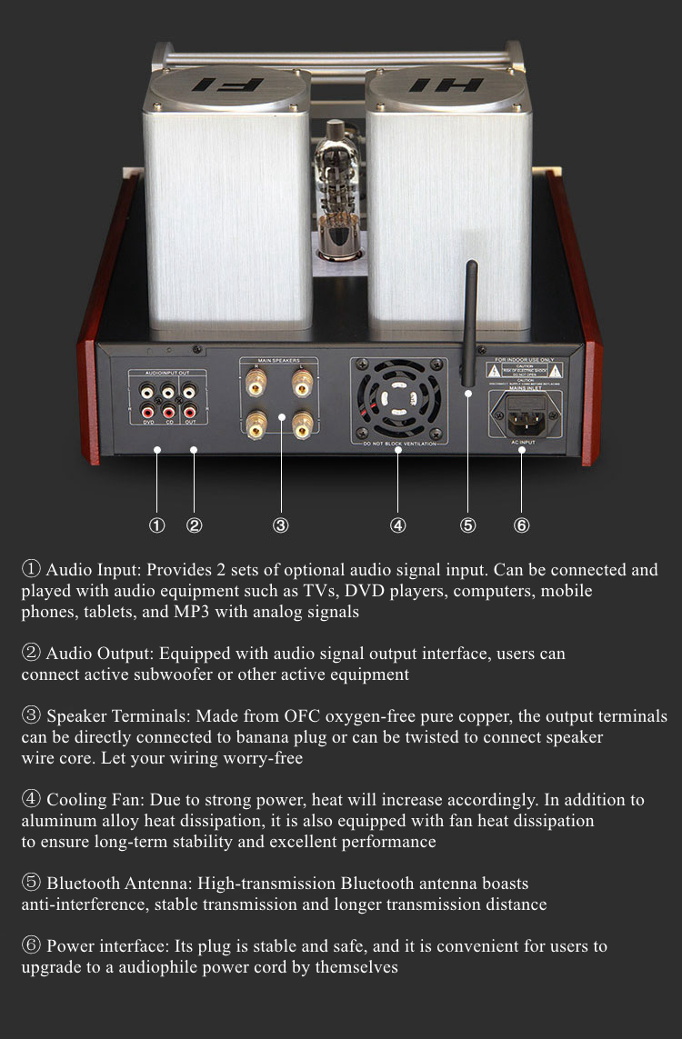 - Audiophile bluetooth tube amp: The output power of class AB tube amplifier can reach 400w. The sound quality is crisp, delicate, dynamic and powerful. Balanced linear sound-resistant and sweet, wide and realistic sound field