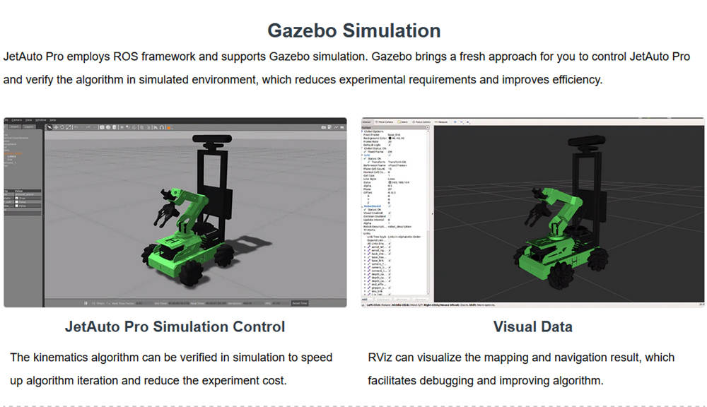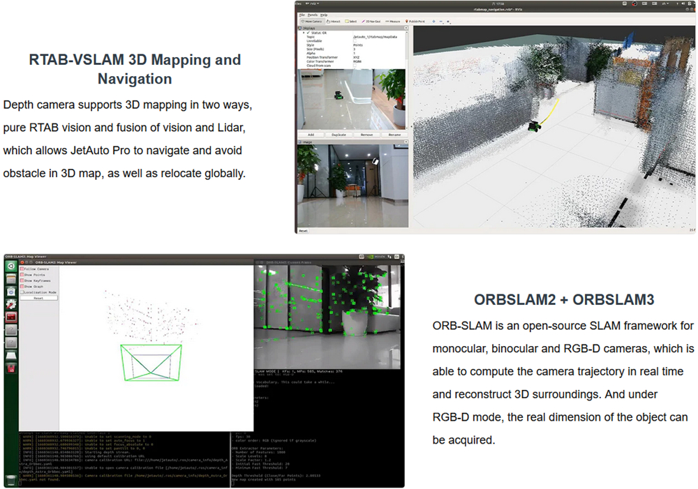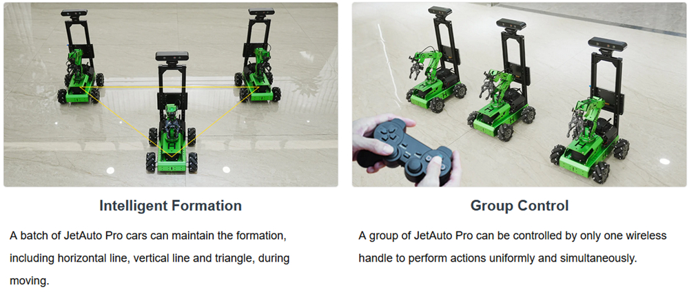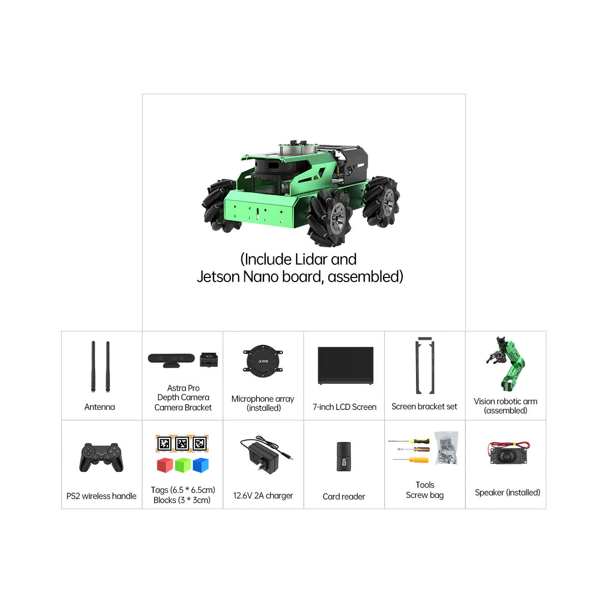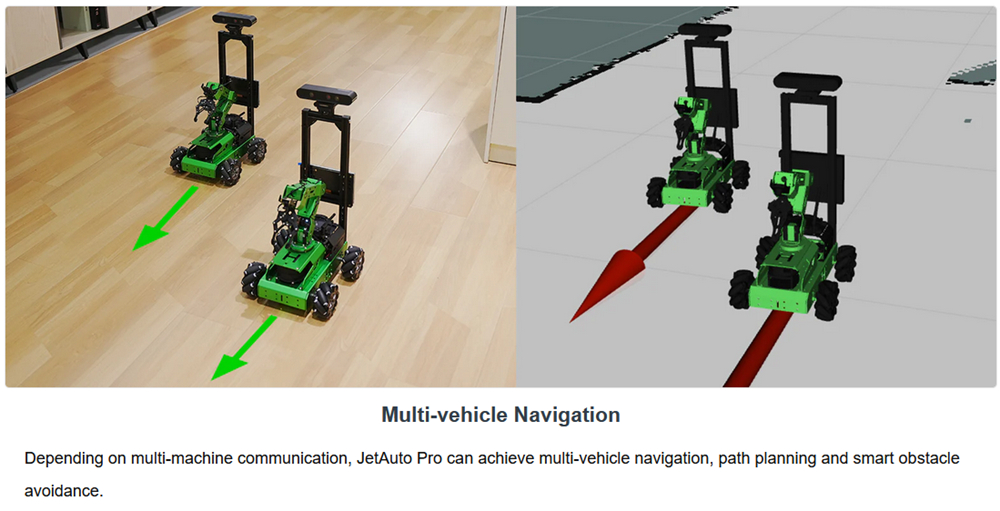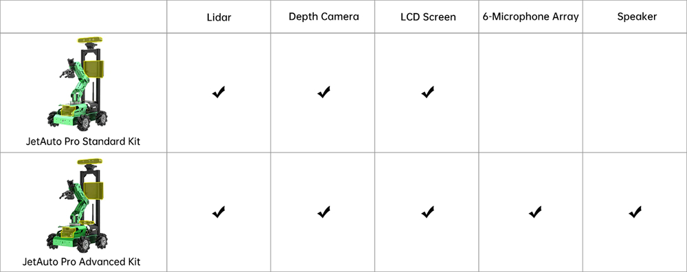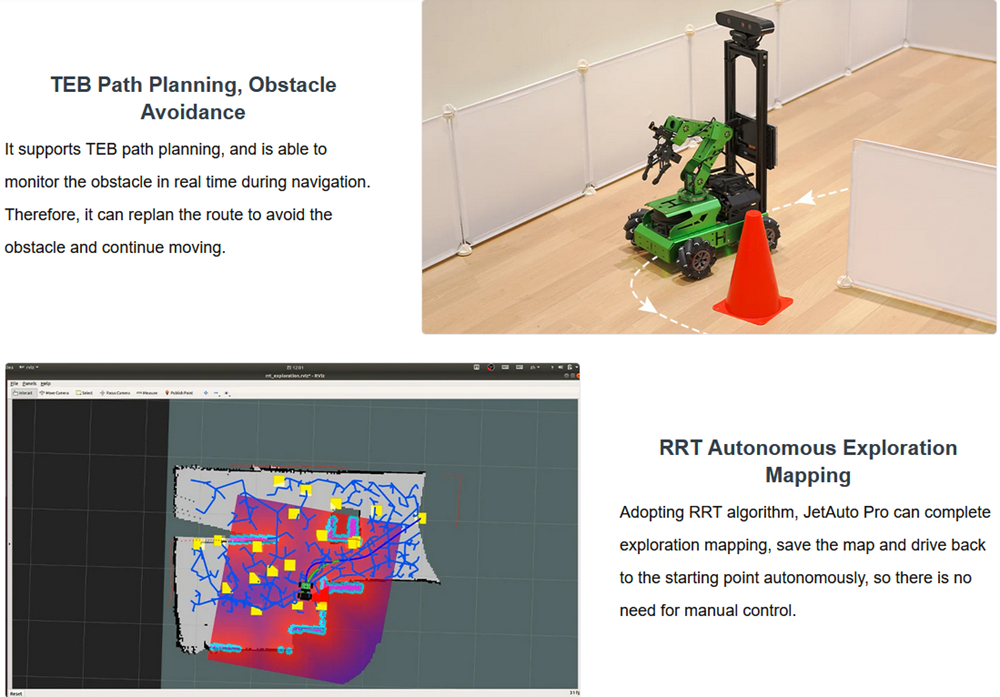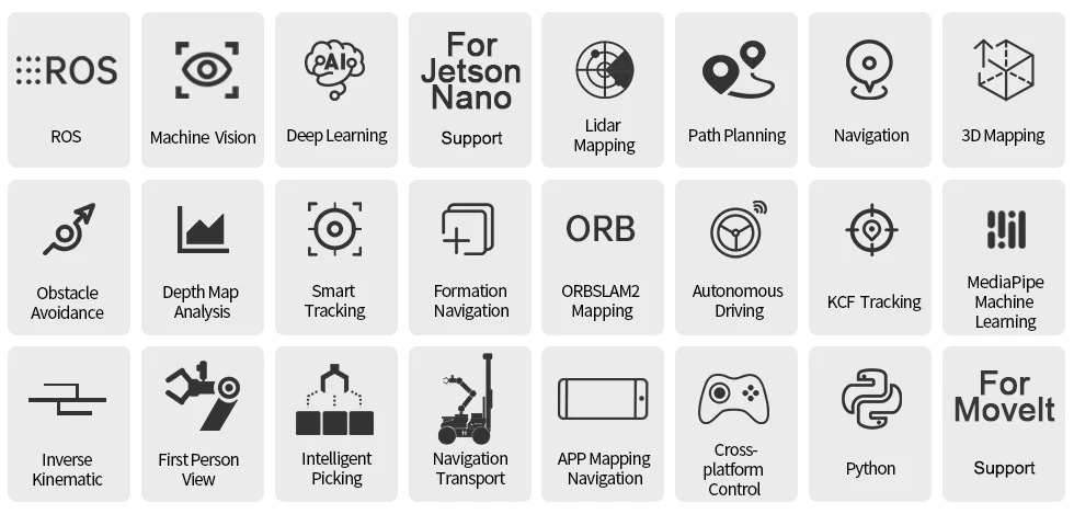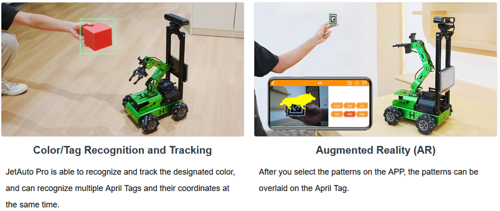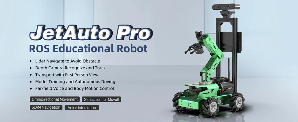 JetAuto Pro is a comprehensive 2 in 1 ROS robot tailored for ROS learning. It is loaded with board for NVIDIA Jetson Nano, AI vision robotic arm, high-performance encoder motor, Lidar, 3D depth camera and 7-inch screen, which open up more functionalities. Robot motion control, mapping and navigation, path planning, tracking and obstacle avoidance, autonomous driving, intelligent picking, simulation for MoveIt, somatosensory interaction and voice interaction all can be achieved!